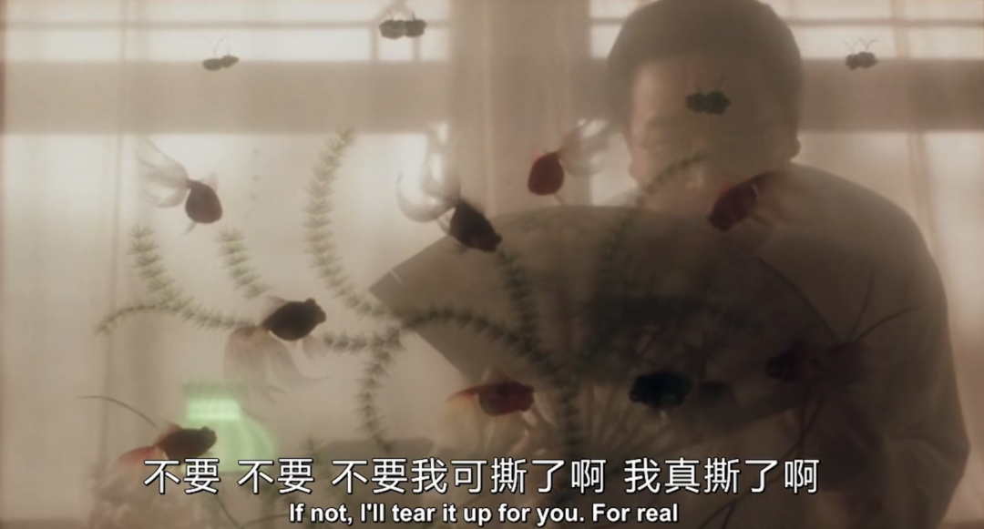 還是這個片段,那爺幫程蝶衣燒完信,隨即拿出一把折扇,對蝶衣說: