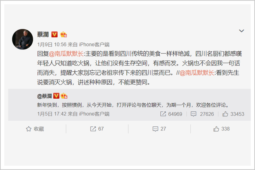 這句話得罪不少人,卻是他有感而發,“年輕人隻知道吃火鍋,老祖宗傳下來的四川菜正在被遺忘。”