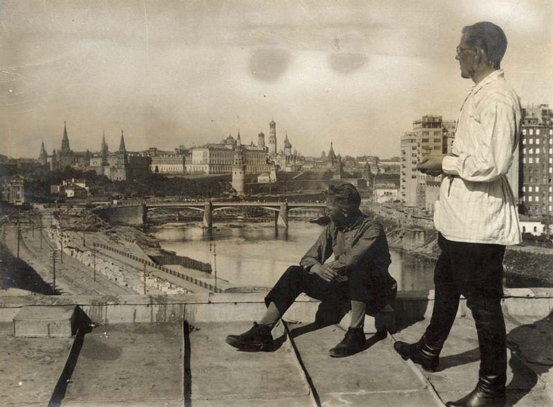 1932年站在莫斯科屋頂上的兩名男子,不遠處就是克裏姆林宮,蘇聯政權的心髒。