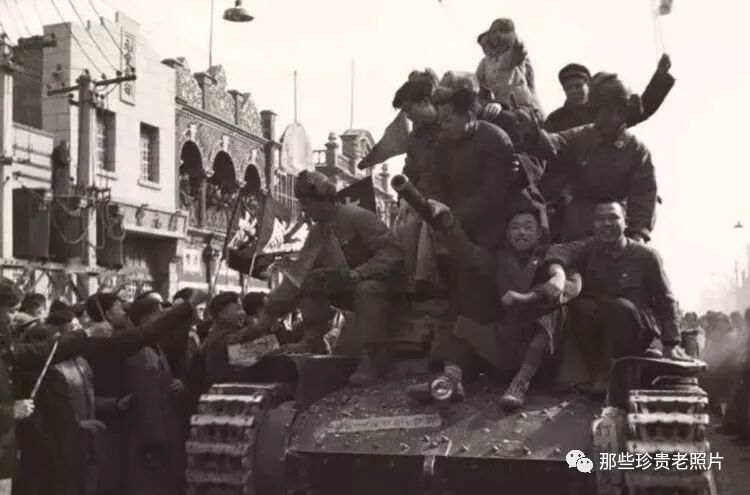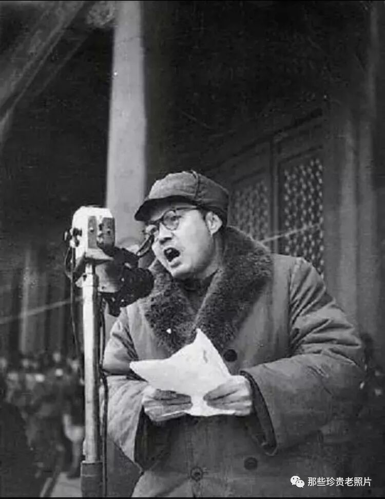 同日,先頭部隊接管北平防務。2月3日,上午10時,解放軍舉行入城儀式。人民解放軍裝甲車隊通過東交民巷使館區。毛澤東要求,我們的隊伍一定要經過東交民巷!晚清以來,這裏一直是外國勢力特權區,中國軍警不得入內。解放軍從此經過,宣告了那段屈辱曆史的終結。這天,高懸毛主席、朱總司令肖像的彩車和軍樂隊,是遊行隊伍的前導。箭樓上,華北野戰軍、第四野戰軍和北平軍管會領導在檢閱入城部隊。同樣是2月3日,這張照片記錄的是長辛店鐵路職工遊行到東交民巷。這張照片是人民解放軍機械化部隊從夾道歡迎的群眾中穿過。一個市民跳上了炮車,在炮筒上寫下“向蔣介石開炮。再給蔣介石一炮”的字樣。清華大學和燕京大學師生爬到坦克上,和人民解放軍共享勝利的喜悅。人民解放軍騎兵出現在市民中,引來了一片歡呼聲。到3月底,毛澤東、朱德、劉少奇、周恩來等中央領導,離開西柏坡,進駐北平香山。毛澤東半身照,攝於新中國成立前夕。在香山,毛澤東完成了解放軍渡江作戰計劃,攻克國民黨政府首都南京。與此同時,他在那裏廣泛接觸各界民主人士,共同籌劃新中國的未來。新中國成立前夕的李濟深。李濟深三次被國民黨永久開除黨籍,1949年代表民革參加新政協會議。1949年6月15—19日,新政協籌備會議在中南海勤政殿召開。新政協的稱呼,是為區別於1946年國共和談時期的舊政協。新政協籌備會議期間,毛主席與中國僑聯第一任主席陳嘉庚(左一)、副主席莊明理(前右一)在中南海勤政殿前合影。1949年9月21日,下午7時,中國人民政治協商會議第一屆全體會議在中南海懷仁堂舉行。會議代表630多人,來賓300人。毛澤東主持新政協開幕式,並致辭。在致辭中,他說了最經典的那句話:“占人類總數四分之一的中國人從此站立起來了!”“我們的民族再也不是一個被人侮辱的民族了。”毛澤東接著說:“讓那些國內外反動派在我們麵前發抖吧,讓他們去說我們這也不行那也不行吧,中國人民通過不屈不撓的努力必將穩步地達到自己的目的。”1949年9月30日晚,新政協會議閉幕。這次會議意義重大,不僅通過了具有憲法意義的《共同綱領》,而且選舉了中央人民政府委員會成員。連國名“中華人民共和國”,也是這次會議敲定的。當時,毛澤東等人習慣稱新中國為“中華人民民主共和國”,在這次會議上,清華大學政治學教授張奚若提出,國名太長,有“人民”就可以不用加“民主”,哪裏有人民而不民主的呢?最終,會議接受這一建議,定國名為“中華人民共和國”。