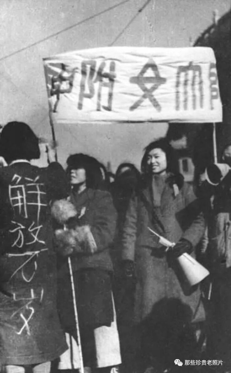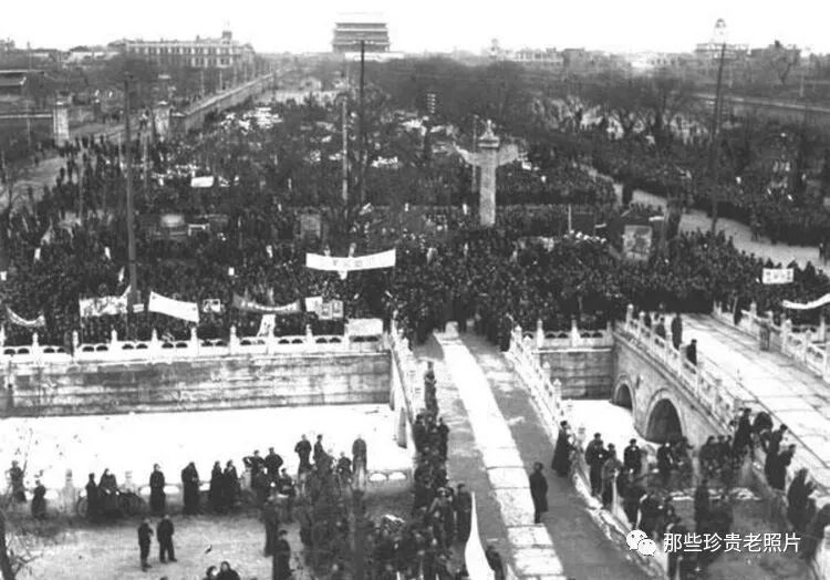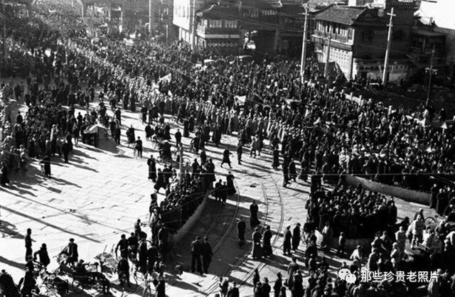1949年2月9日,慶祝北平解放大會在天安門舉行,天安門城樓上懸掛著大幅毛主席像。