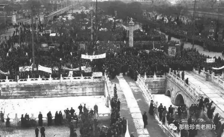 北平各界慶祝和平解放,群眾在天安門前聽北平市市長葉劍英講話。