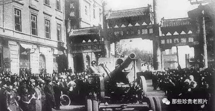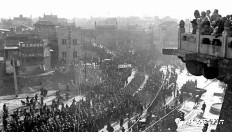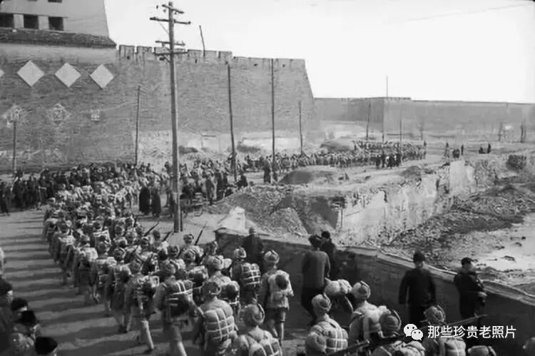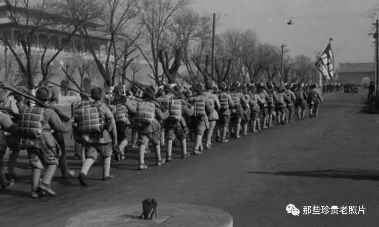 慶祝北平解放大會上,端坐著的解放軍戰士。他們都是戴著狗皮帽子,正是林彪的四野部隊。這四野打戰確實有一套,從東北一路向南,打到了海南島。