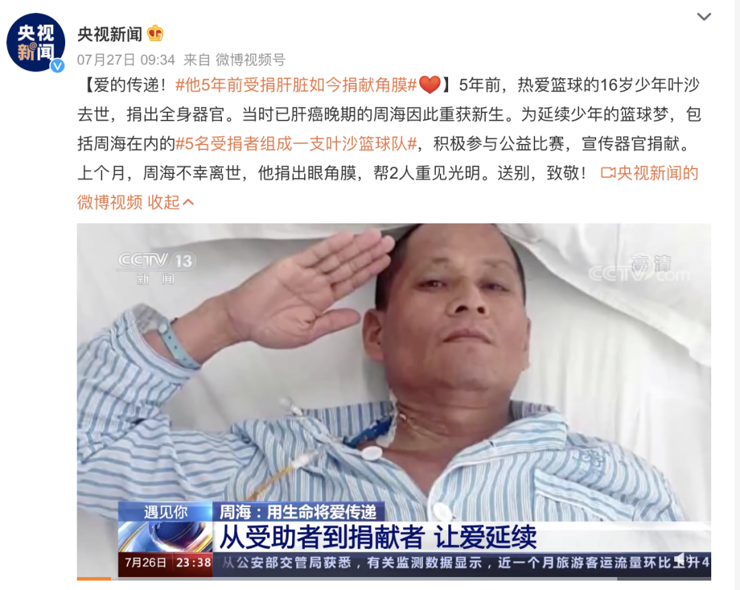 今年6月13日,球隊成員周海(即周斌)不幸去世,臨終前,他選擇捐獻了自己的眼角膜。