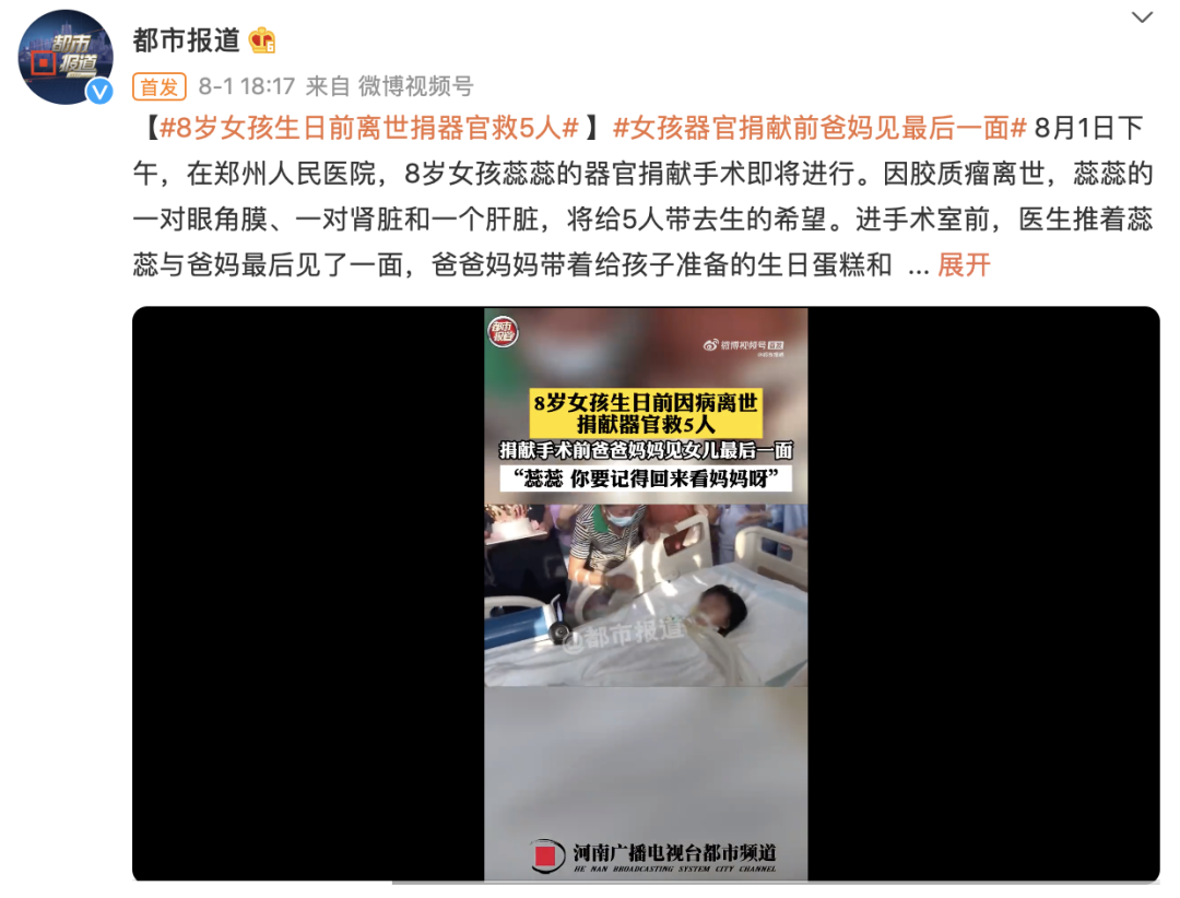 8月1日,來自新密曲梁8歲女孩時心蕊因為膠質瘤離世,生命的最後,她捐獻了一對眼角膜、一對腎髒和一個肝髒,拯救了5位患者的生命。