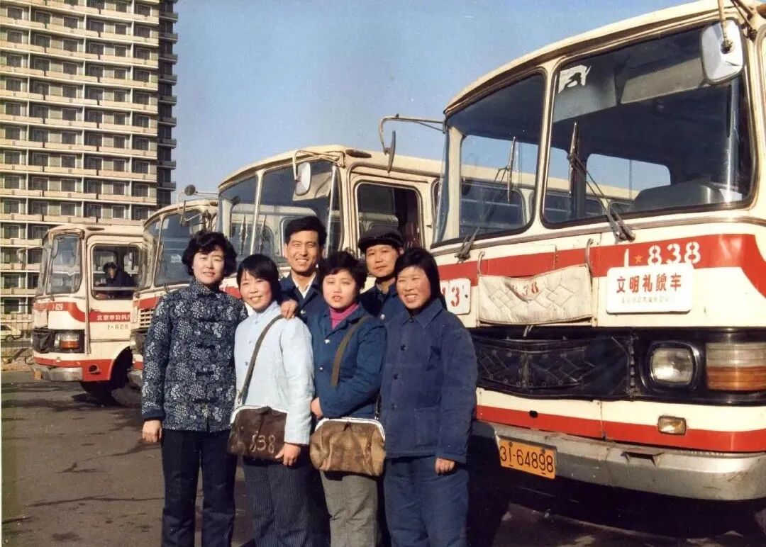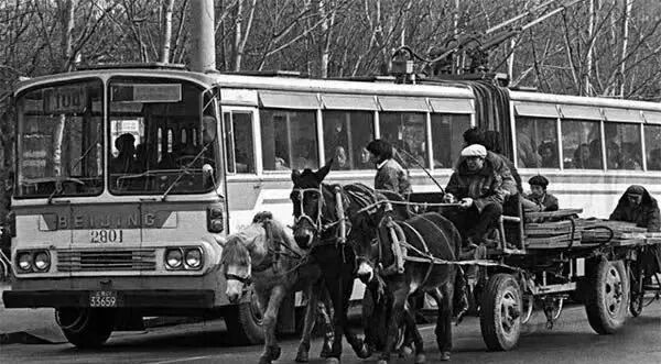 後來先進了,不用軌道了。20世紀80年代薑昆說了個相聲叫《我與乘客》,說的就是“104路大無軌”。車上的椅子是木條做的,很硬,粉色的漆,車身是淡藍色,兩個大辮子,有時候倆辮子擰到一塊兒了,司機下來分開再走。現在電車還有辮子,但是遇到不設電線的地方就自動收起辮子,到了有線路段時再自動升起。如今北京的公交車已經大部分是電動車了,又快又安靜,裏麵的電子設備也很多。