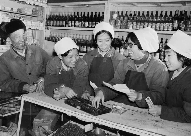 傳統的副食店售貨員是在櫃台裏麵,台麵上擺著菜,你要什麽他們給你稱重計價,早先的秤是杆秤,後來是托盤天平式的,比較先進。