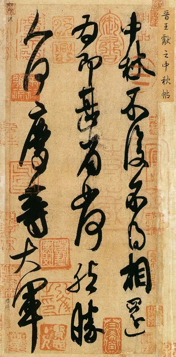 《中秋帖》傳為王獻之所書,與王羲之的《快雪時晴帖》,王珣的《伯遠帖》合稱“三希”,現藏故宮博物院。《書斷》中說:“字之體勢,一筆而成,偶有不連,而脈不斷,及其連者,氣候通其隔行”。《中秋帖》是《寶晉齋法帖》、《十二月割帖》的不完全臨本,原帖在“中秋”之前還有“十二月割至不”六字。