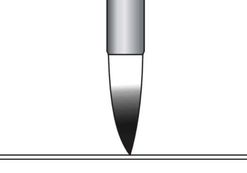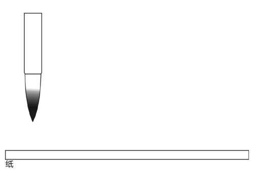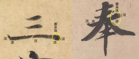 這中間有一些物理現象:按壓停頓造成墨汁下注過量,透過紙背,形成濃墨區。提筆快速行筆時注墨不足,形成淡墨或枯筆。搓紙提筆,利用筆毛本身的彈力、筆紙間的摩擦力和墨的表麵張力讓筆鋒重新立起聚攏。提筆過程由於墨汁的表麵張力,墨汁凹月麵隨筆鋒提起而提起,筆鋒提起處形成黍米珠。