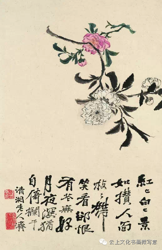 題識:紅紅白白景如攢,人麵枝枝帶笑看。卻恨有花無好月,夜深猶自倚欄幹。清湘老人濟。