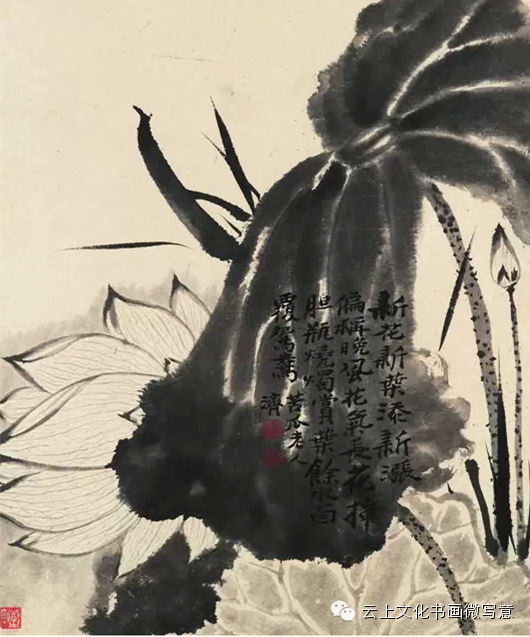 題識:新花新葉添新漲,偏稱晚風花氣長。花插膽瓶燒燭賞,葉餘水麵覆鴛鴦。苦瓜老人濟。