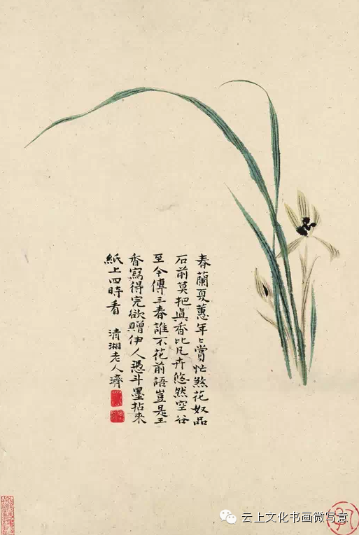題識:春蘭夏蕙年年賞,忙煞花奴品石前。莫把真香比凡卉,悠然空穀至今傳。三春誰不花前語,豈是王香寫得完。欲贈依人憑鬥墨,拈來紙上四時看。清湘老人濟。