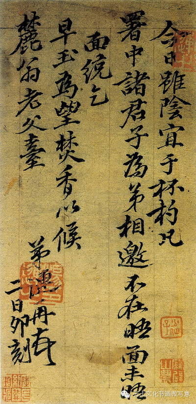 楊漣(1572-1625),字文孺,號大洪。應山(今湖北廣水)人。累官至左副都禦史,以敢言著稱。有《楊大洪集》傳世。此兩劄內容都是邀麓翁相聚,可側見其時東林士人雅集之逸事。此劄書法風格近前方孝儒劄,可見他們雖不同世,但誌向、操守近,因而筆下自有相通處。但與方劄相比,字之棱角更見分明,行筆亦勁利,所謂合而不同者也。