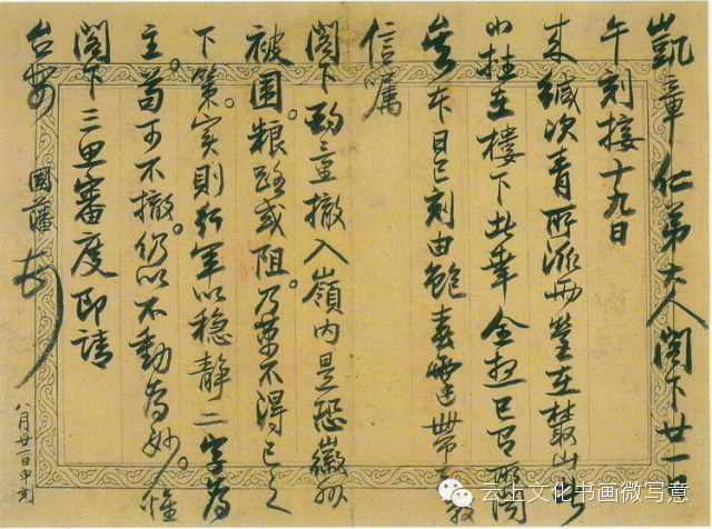 金農,“揚州八怪”的重要代表。他性格孤高,精於鑒別,為書畫新奇別致但又古意盎然。其書法所來有自,於漢隸用功極深,又能以奇出之,形成獨標一幟之自家麵目,人稱“漆書”。他的大字稍顯做作,但小字卻自然高古,筆短趣長,拙樸雅健。此劄內容為請托朋友,言辭謙敬慎重;書法蒼樸老辣,方圓兼備,極為精彩。