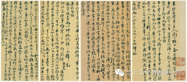 倪元璐書法近黃道周,但氣格更勝,比黃道周更為奇崛。黃道周曾謂:“抹蔡掩蘇,望王逾羊,宜無如倪鴻寶者。但今肘力正掉,著氣太渾,人從未解其妙耳。”可見推崇備至。倪書用筆蒼勁古拙,飛揚恣肆,結體出於顏蘇,但展脫挺健,得顏蘇之精神。此劄內容為慰亡,寫得沉痛哀婉,但又以通脫之觀點為生者解說,言簡意深,於平常俗事中見高遠之懷。所書結體端正,行筆樸厚而活潑,極為精彩。