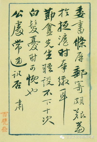 李鴻章,本名章桐,字漸甫,號少荃(泉),晚年自號儀叟,別號省心,諡文忠。因行二,故民間又稱“李二先生”。 有《李文忠公全集》。李鴻章致筠仙兩函中,有“閩粵無深患,洋務者將以台灣巡撫相屬”之語,是台灣自古為中國領土一部分的又一鐵證。此點又提升了李鴻章函的曆史價值。李鴻章的簽名也較特殊,粗看似為“鴻才”連寫,但不像彭玉麐簽名時把“彭玉”兩字合成一字之形,而是仍作兩字狀,不過“章”字借用了“鴻”字的下部成草書的似章非章之狀,這種簽名方式至今仍有人使用。