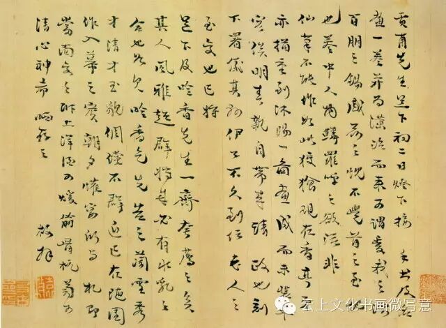 史可法自幼聰慧,有奇才;師從東林黨人左光鬥。此兩劄內容都為朋友問言詩文事。其書法贈益之劄寫得豪邁雄強,筆勢奔騰,結體碩大,亦可見奇崛之氣流於字裏行間;另一劄寫得較謹嚴公整,清氣蕩漾。兩劄書法風格對比強烈,應該是所書時心境及所予對象不同而致。史司法書法較少見,雖不以書名,但其字亦卓然俊偉,蓋與黃道同、倪元璐輩屬同一流人物,觀之令人心動。
