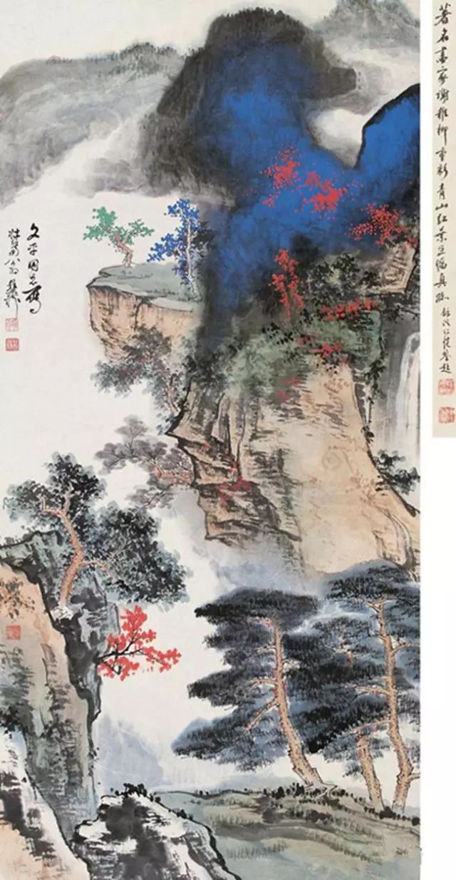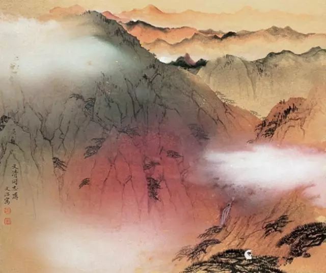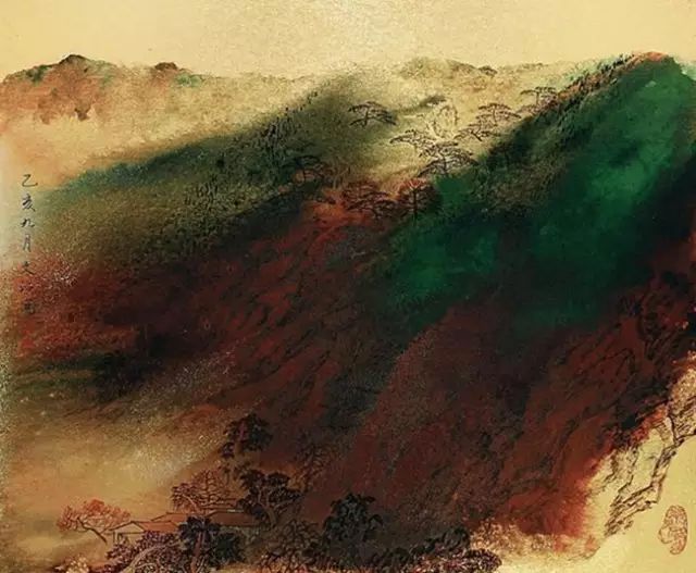 畫家於1949年前在大陸所寫的山水,都是遊覽名山偉川後有感而作,很多都有畫家入山之細膩描寫,離開大陸後,改變形式,以西方抽象手法表現山水,層層潑彩,好像隔著畫家與山的一片薄霧,張大千不再進入山中,而是在遠方張望,超出塵外。