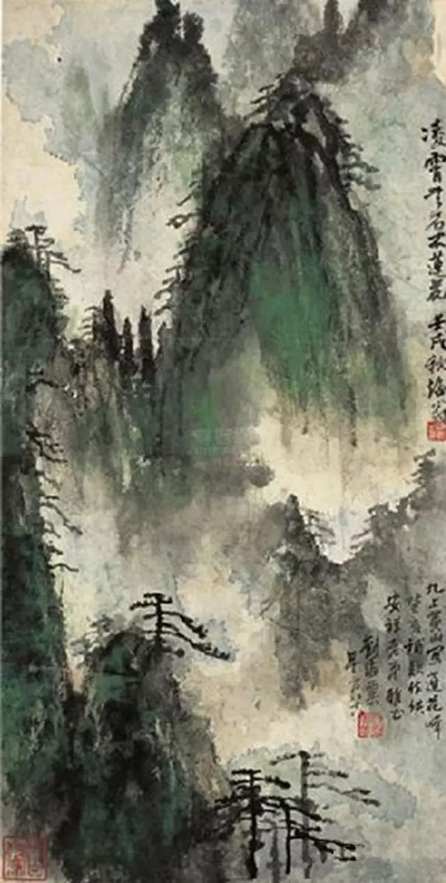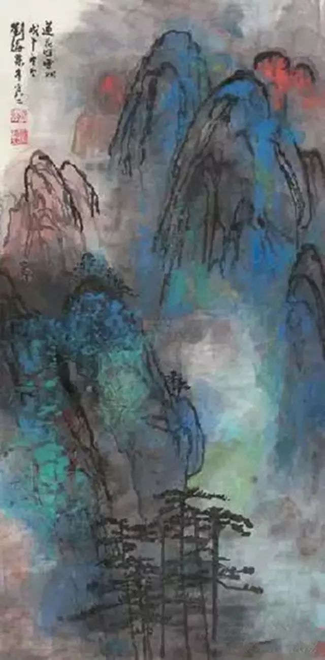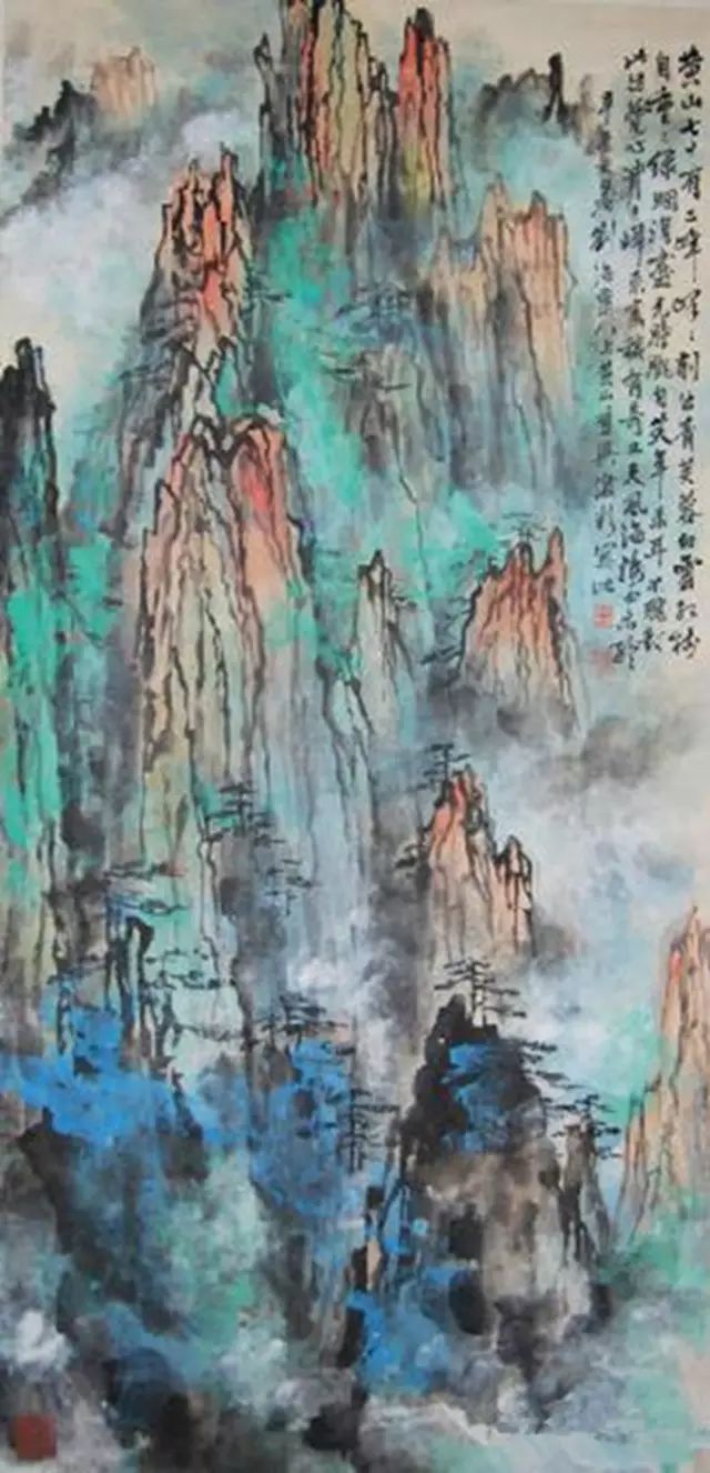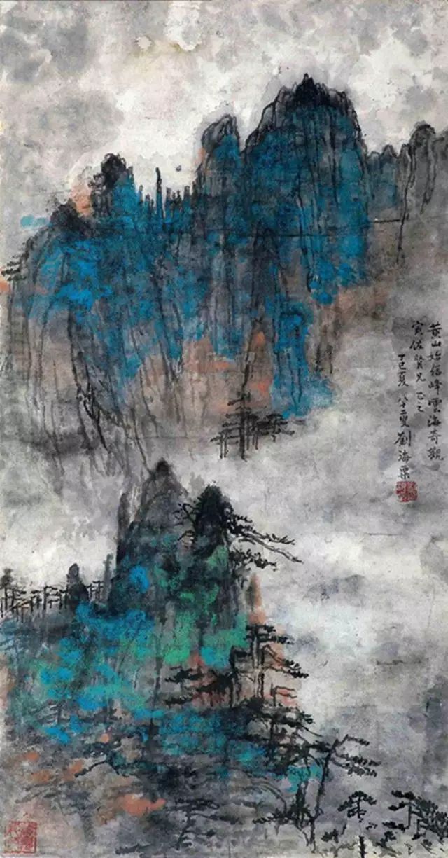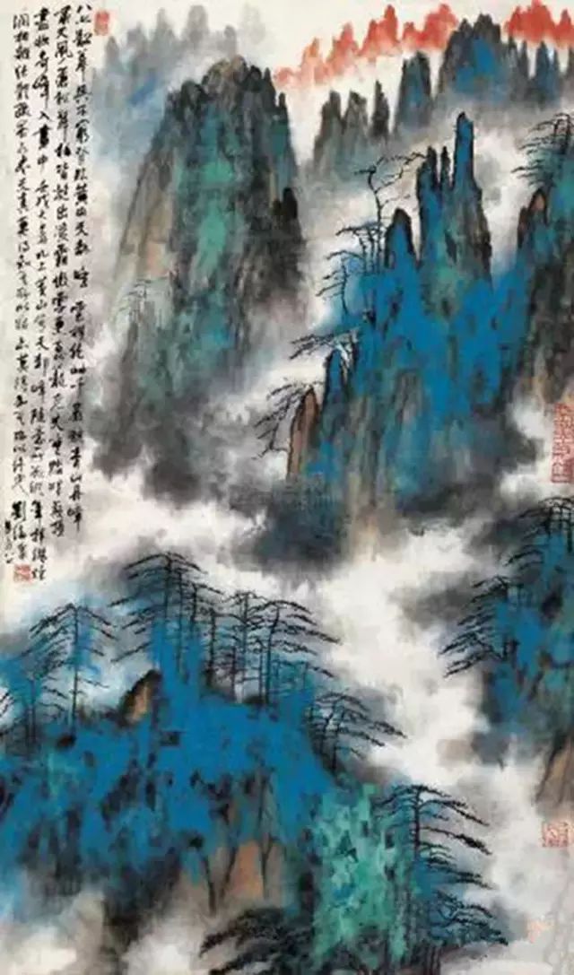 這幅是劉海粟九上黃山後的作品,劉的潑彩法,用色厚重濃烈,與張大千“清透”風格的潑彩法比較,他的風格尤顯渾厚凝重,具有油畫的意味但不失中國畫的氣派與精神,劉海粟晚年的潑彩畫可以說代表了他一生藝術探索的成果,這就是以國學為基,以西畫(主要是油畫)為媒,以生活為源,以書法為骨,以氣韻為主,以精神為本,創造出了具有“大氣、逸氣”風貌卓異,不同凡響的中國畫的時代新作。