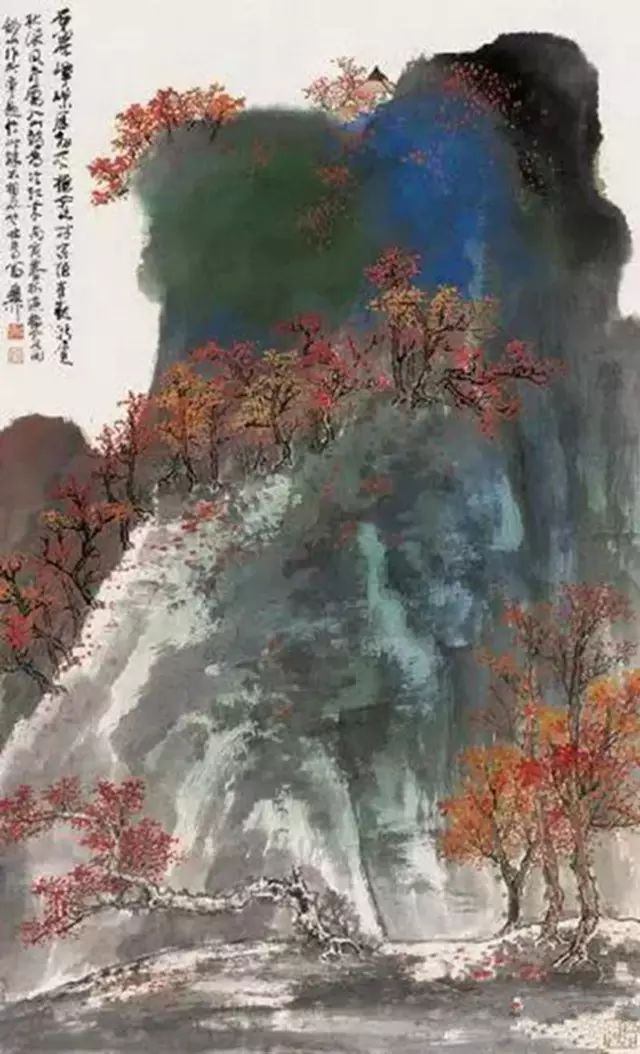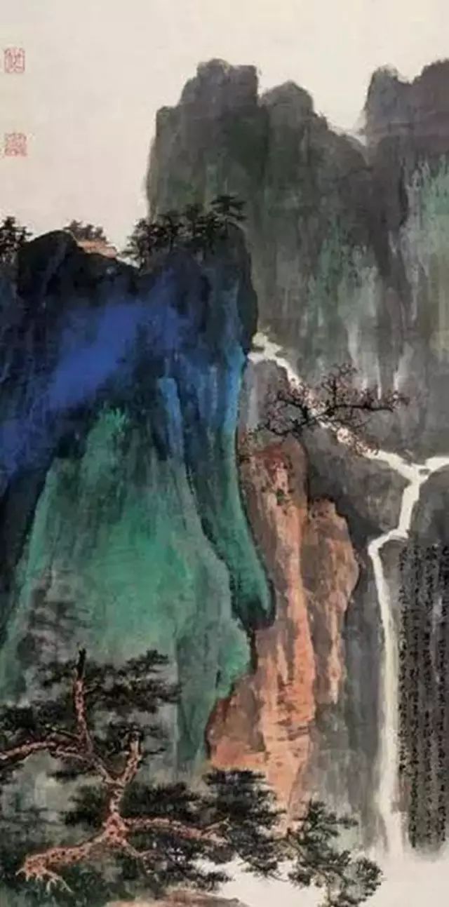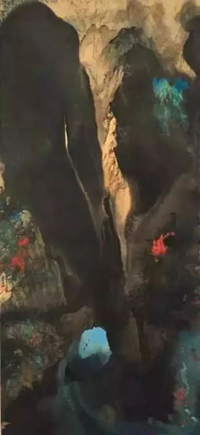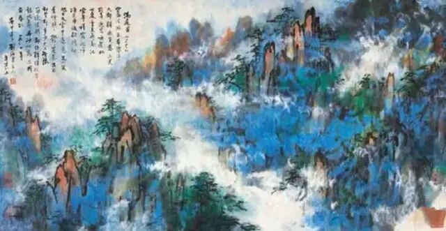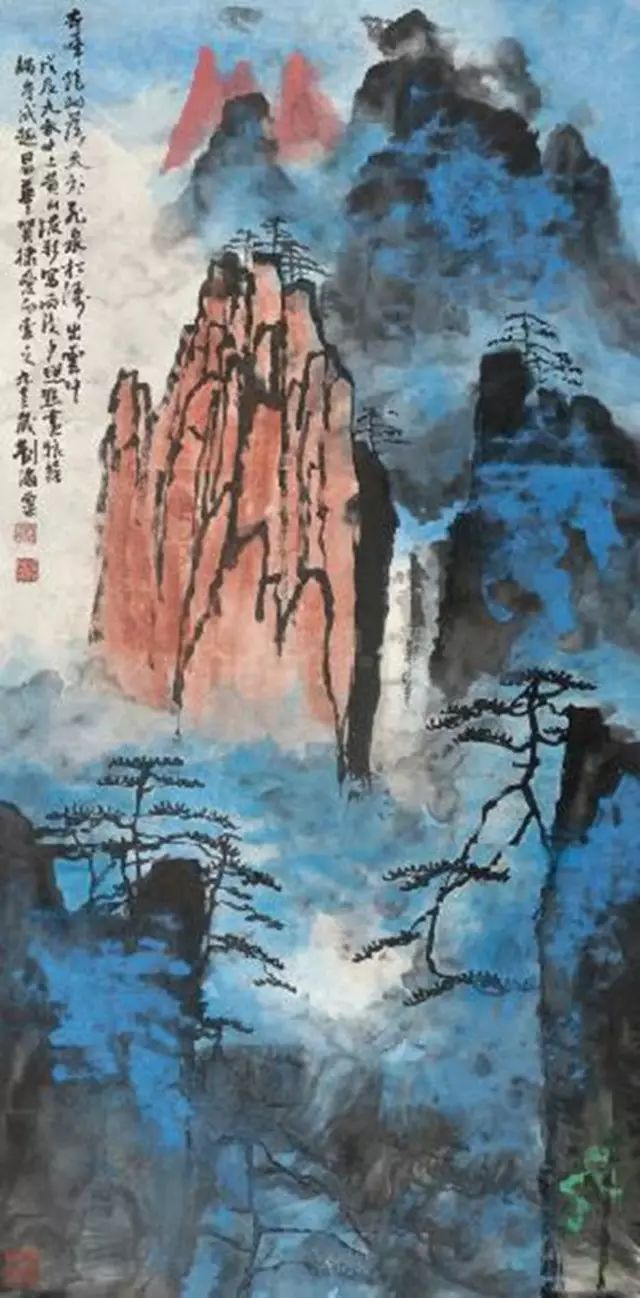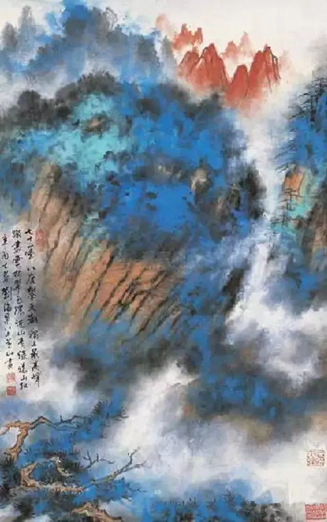 劉海粟的潑彩法與張大千的潑彩不同,大千以青綠水墨為基調。劉海粟則善於在恣意潑灑的青、紅、藍、白等色彩的強烈對比中追求和諧,此幅《蓮花峰》正可為證。畫幅中各種色彩交相揮灑、交相融合、交相輝映,在強烈的視覺張力中突現審美對象的獨特魅力。