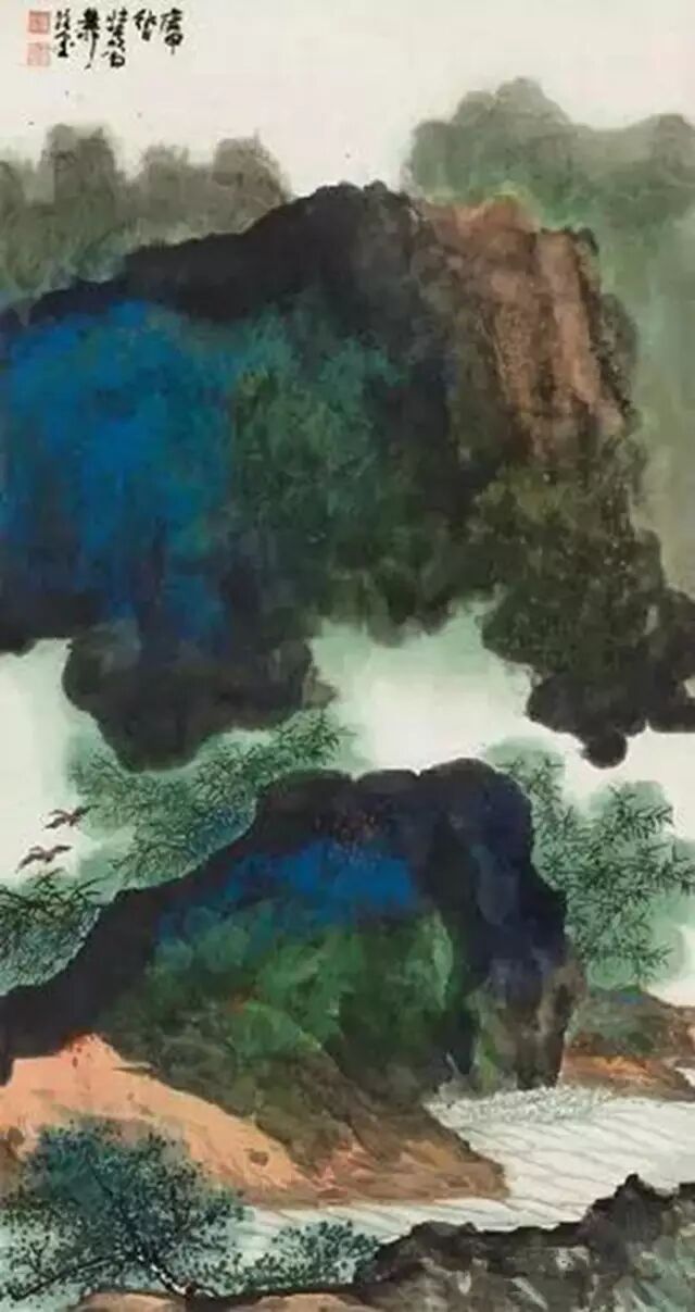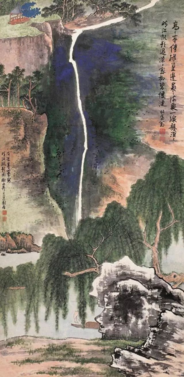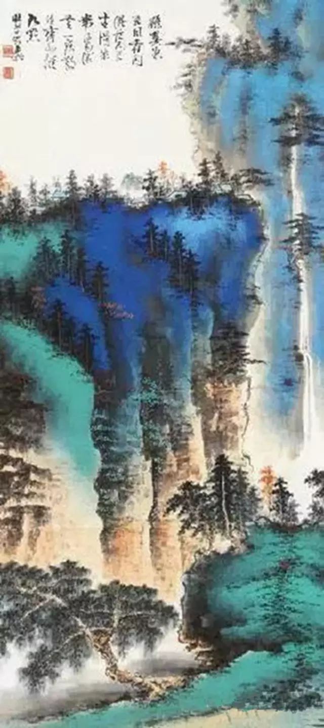 張大千的潑墨山水開始於上世紀五六十年代居住巴西時期,雖未接受過正式西洋畫訓練,但張大千的接受性和領悟力強,將前中國畫家曾用過的潑墨法,變化成層層的潑彩,水份控製得宜,保留一些空白。