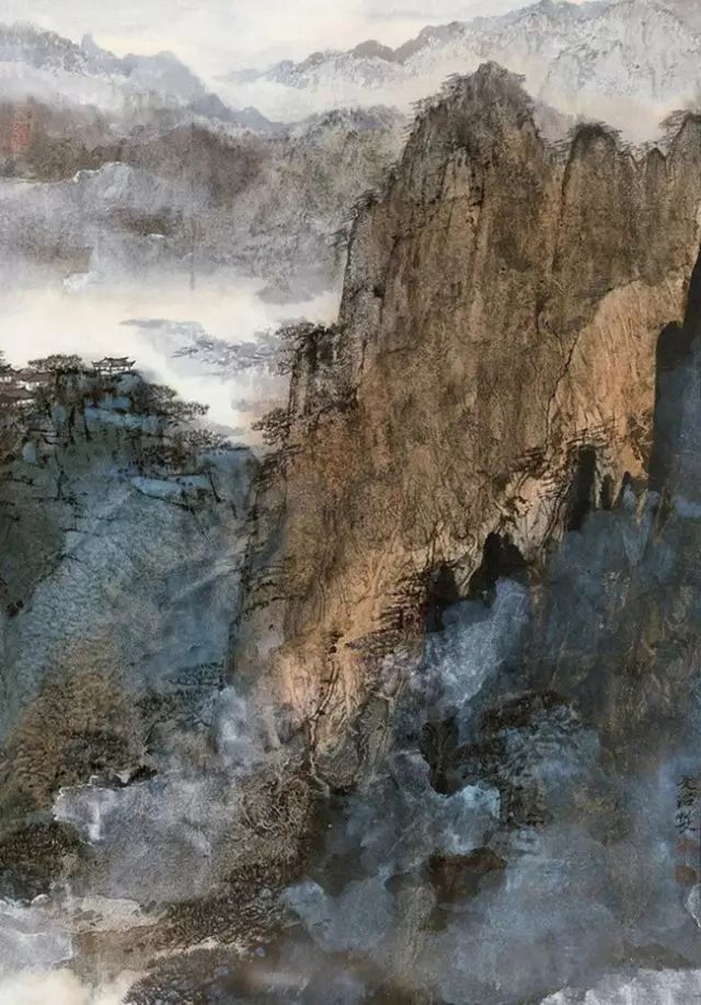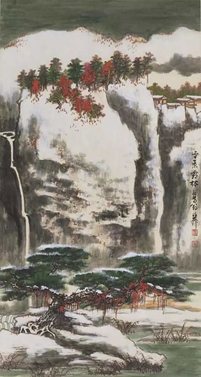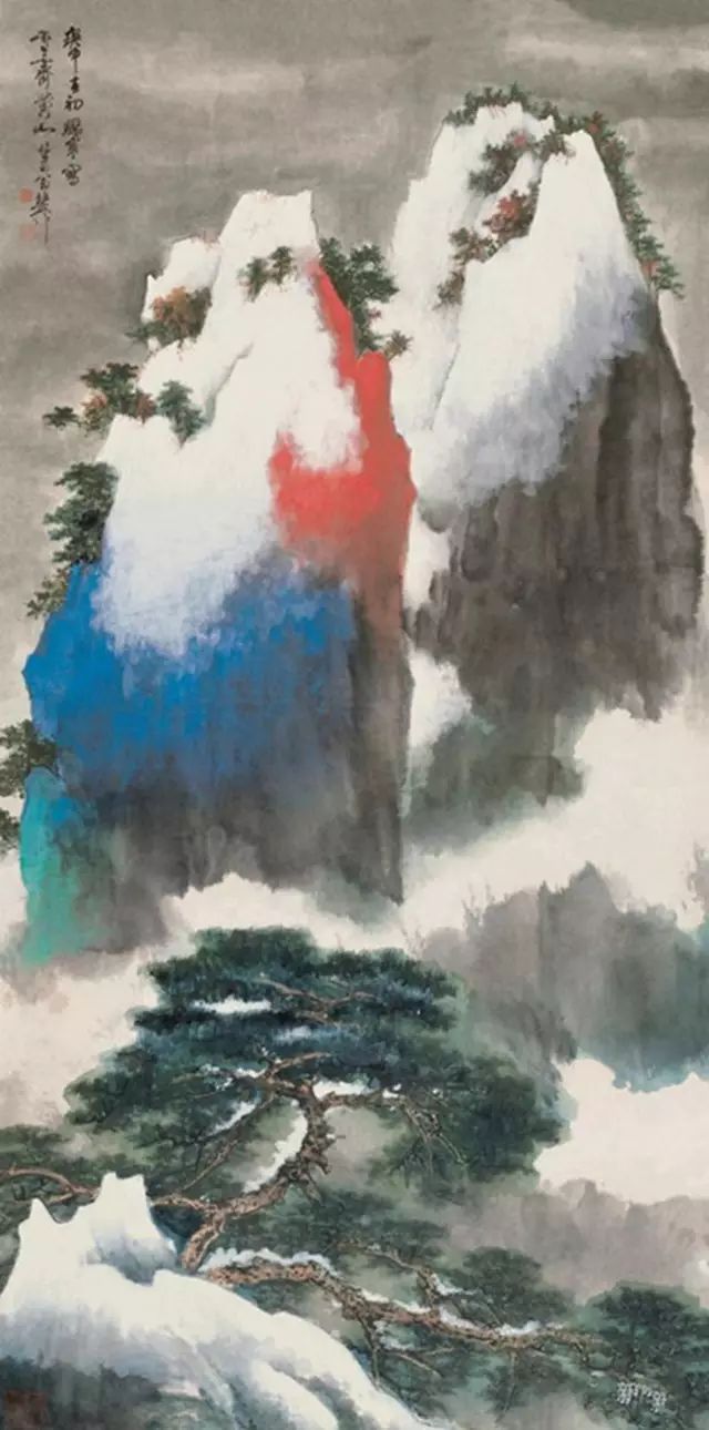 “霽”,雨雪落後初晴也。當陽光照射在覆蓋著皚皚白雪的群峰上時,由於陽光的折射與周遭景物的反射所表現出的不正如畫中描繪的那樣絢爛。石青石綠的溫潤,洋紅的濃烈,加之墨色的浸潤,大千世界的玄妙與不可思議被謝先生轉化成了可能與美妙。雲霧繚繞群峰,愈見壯闊;古鬆虯曲盤旋更增靈秀之致。