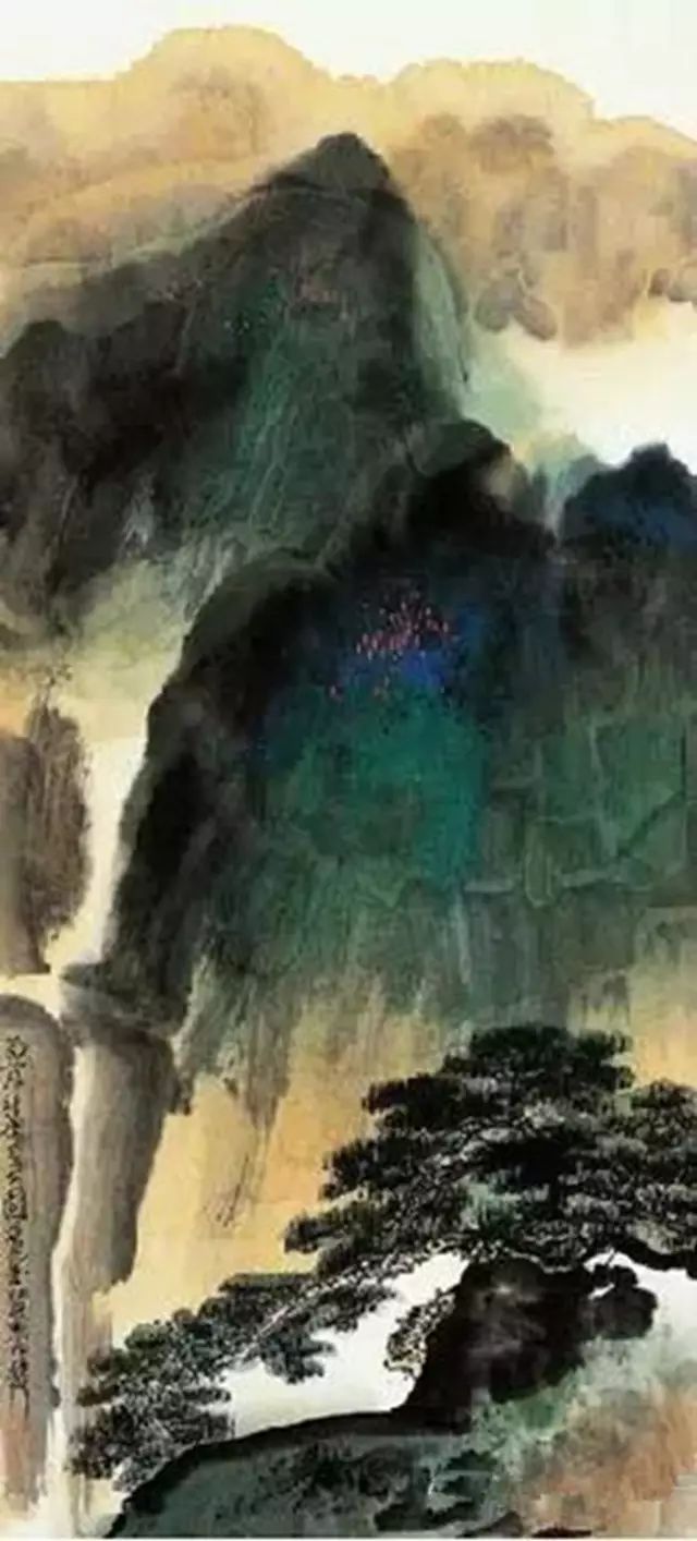 此《潑墨山水》正是張大千潑彩山水的典型風格,除了山頂少數的屋宇、林木,多以幻化的墨色和礦物彩揉合在一起,近景大樹隻占整幅畫高度的九分之一,襯托出煙嵐之上的山口是那麽的高聳,中景的白雲橫鎖山腰,趁著水份未乾之際,以白粉撞入。