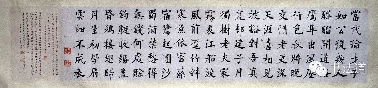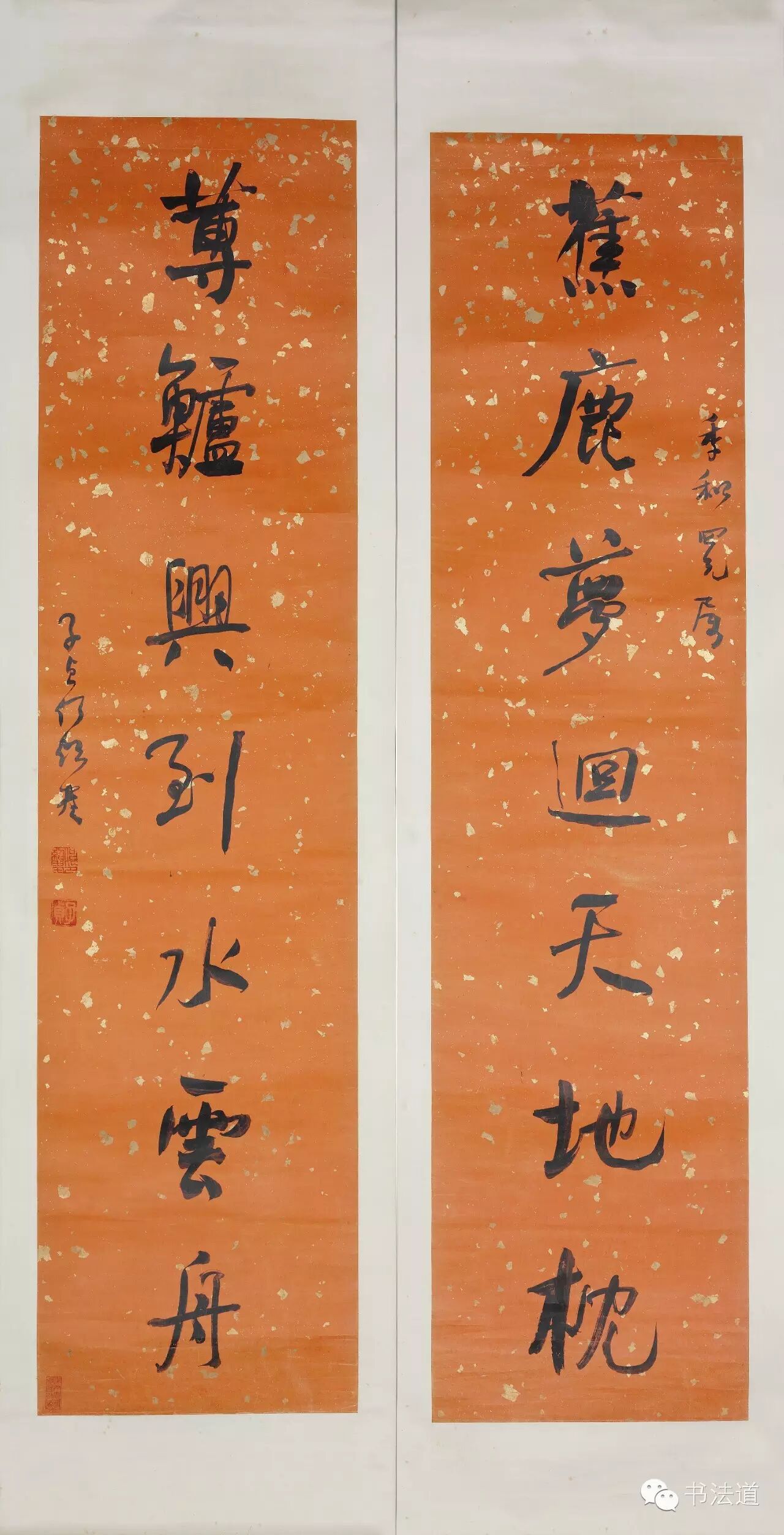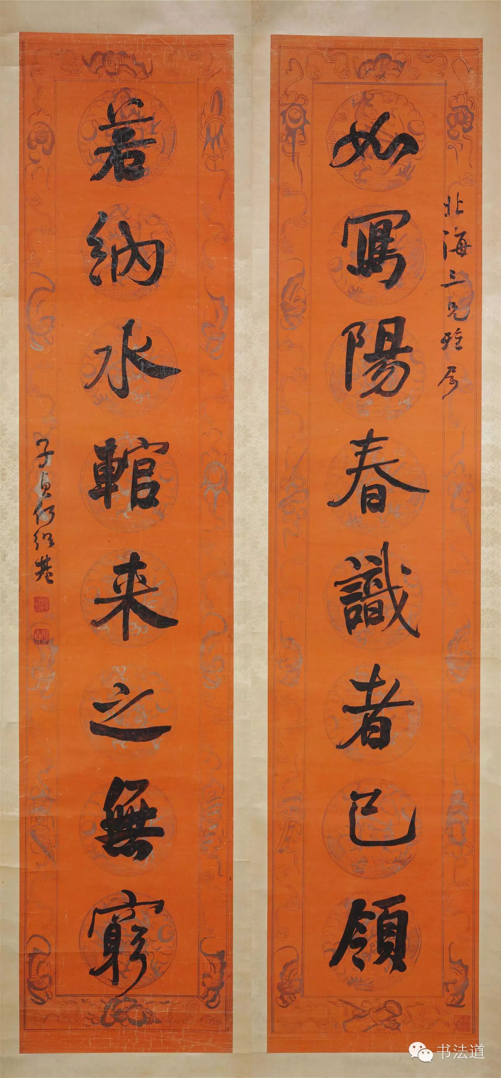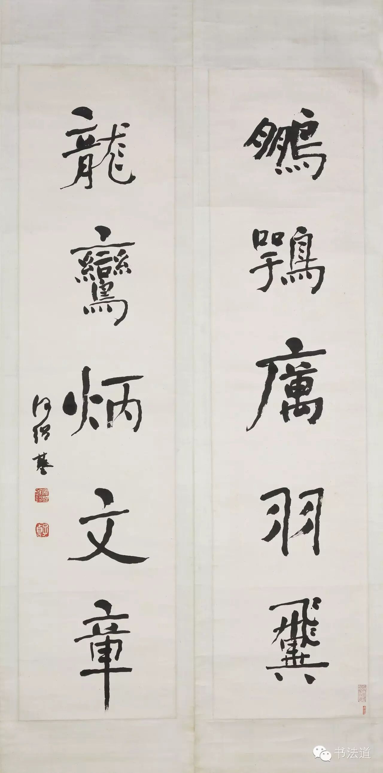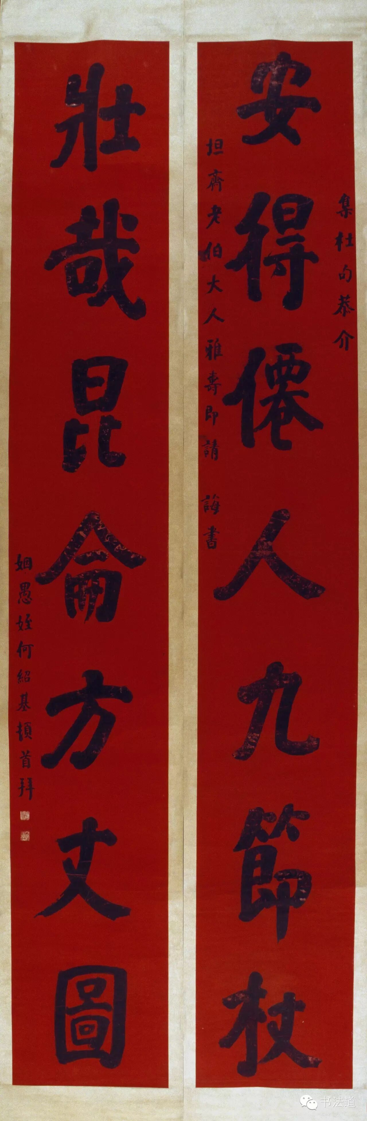 這類對聯屬於榜書,氣象雄偉,場麵非常震撼。榜書在古代叫“署書”,又稱“擘窠大字”,以大字題署宮殿匾額。榜書最初主要用於讚頌帝王功德,裝飾皇家宮殿、苑囿,後來發展到題寫宅第、寺廟、城樓、園林、山川等,最後進入尋常百姓家。