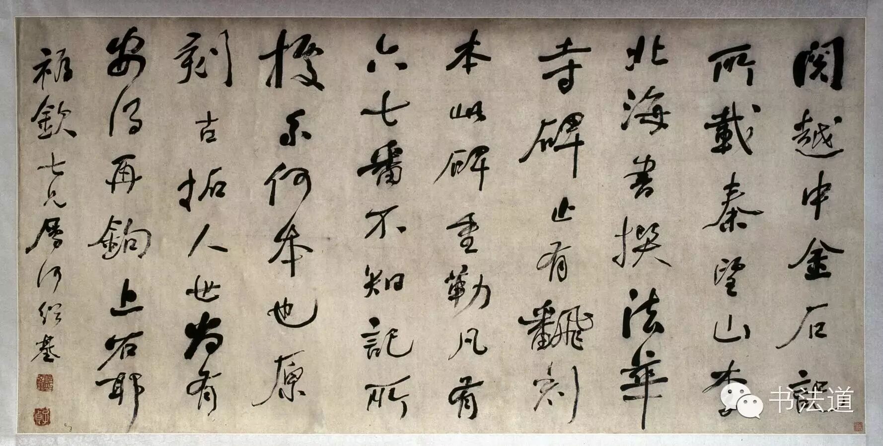 這幅對聯寫的是“蕉鹿夢回天地枕,蓴鱸興到水雲舟”,取自元朝詩人仇遠的作品。“蕉鹿”是《列子》裏的一個故事,用來形容夢幻之境。“蓴鱸”出自《世說新語》,是思念故鄉的意思。