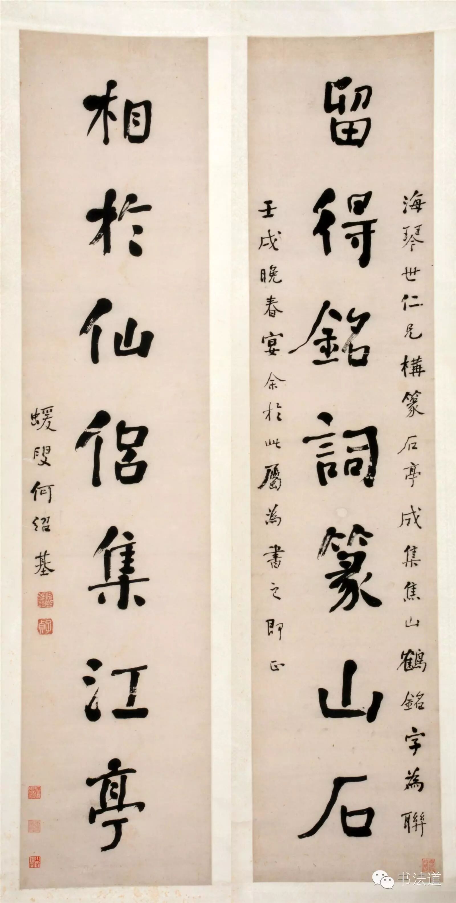 釋文:留得銘詞篆山石,相於仙侶急江亭。海琴世仁兄構篆石亭成,集焦山鶴銘字為聯。壬戌晚春宴餘於此,屬為書之即正,蝯叟何紹基。