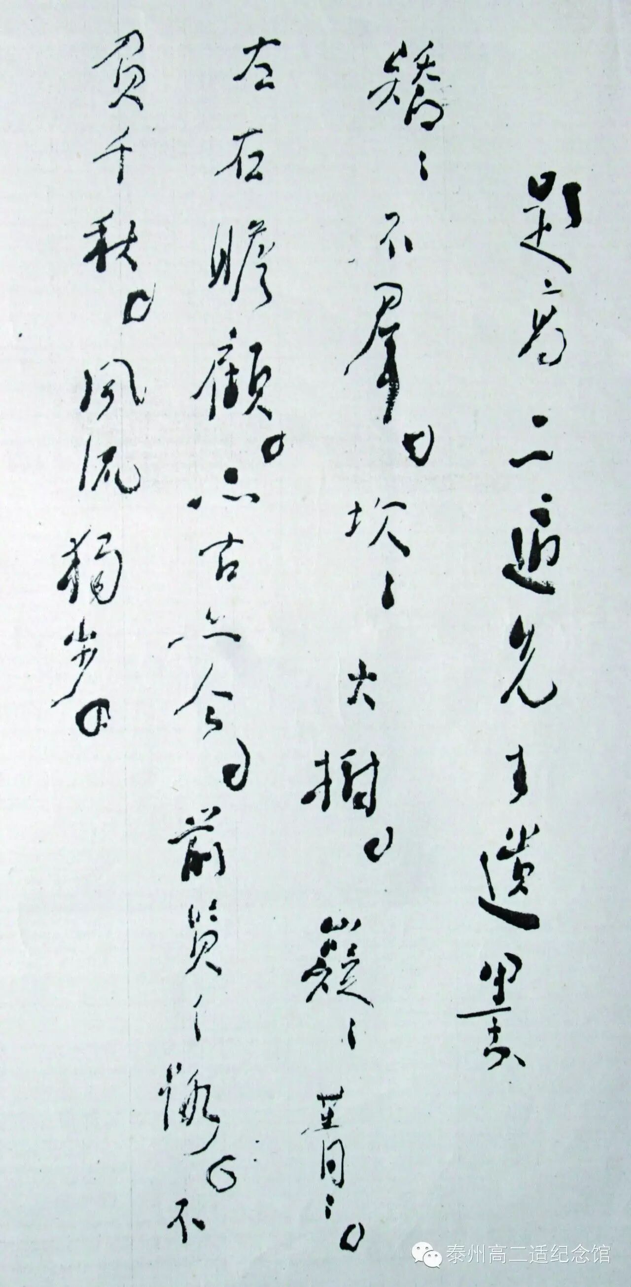 林老晚年很少外出參加活動,但是十餘年來,凡是高老的作品展覽及有關的紀念活動,雖是耄耋之年,衰殘之驅,林老除題詞書匾外,總是親自到場。1987年3月15日,高二適遺作展覽在省美術館隆重開幕,《南京日報》在報道中寫道:“就連近來很少外出的著名書法家林散之老人也坐著輪椅前來參觀,並在一位學生的記錄本上寫下他的感受。”高老的展品陳列於三樓,林老是坐在輪椅中被抬上了三樓,而他所寫下的感受,實是一首四言詩——《題高二適先生遺墨》:“矯矯不群,坎坎大樹。嶷嶷菁菁,左右瞻顧。亦古亦今,前賢之路。不負千秋,風流獨步。”這是一位書法大師對另一位書法大師的作品的由衷讚賞和崇高評價,表現了多麽博大的胸襟和氣度。