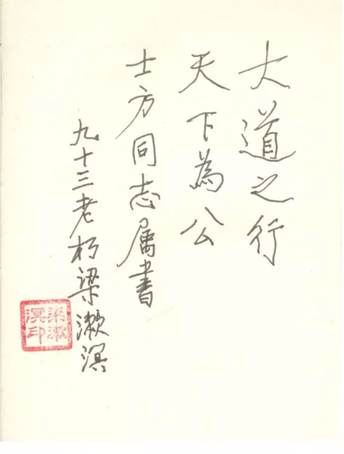 書之妙道,神采為上,形質次之,兼之者方可紹於古人 神采是書法最迷人之處隻要學問夠了神采自然流於筆墨間 ▲梁漱溟 著名的思想家、哲學家、教育家、社會活動家、愛國民主人士,著名學者、國學大師,主要研究人生問題和社會問題,現代新儒家的早期代表人物之一,有“中國最後一位儒家”之稱。梁漱溟受泰州學派的影響,在中國發起過鄉村建設運動,並取得可以借鑒的經驗。