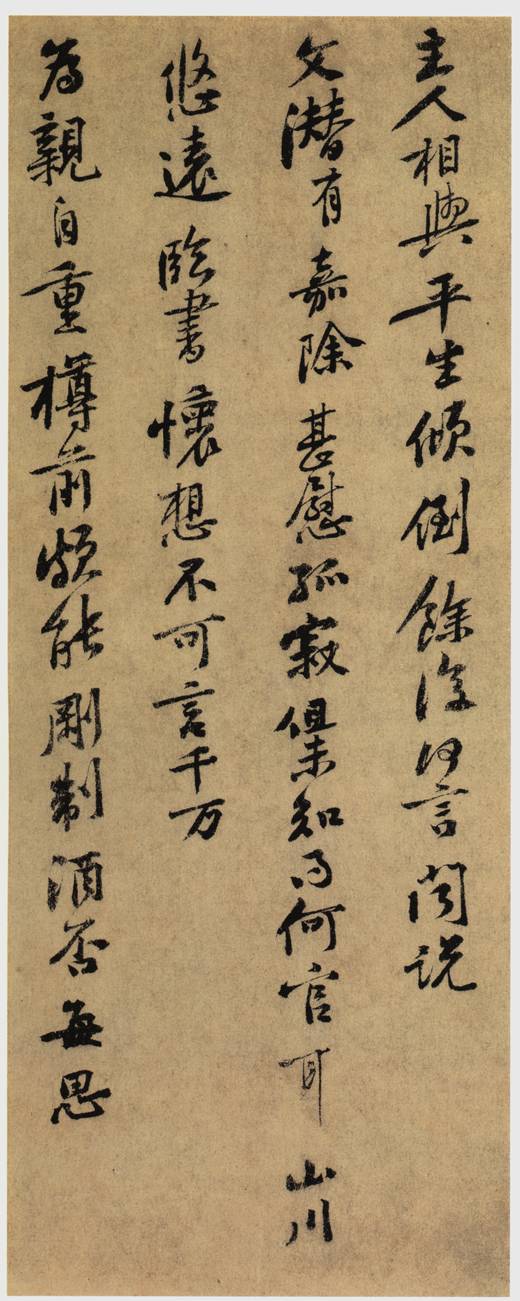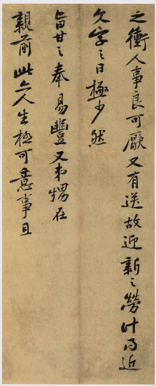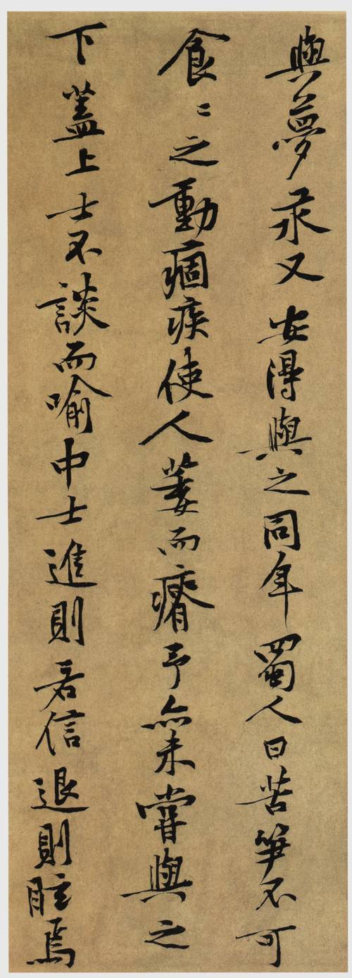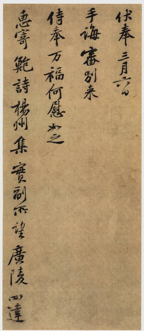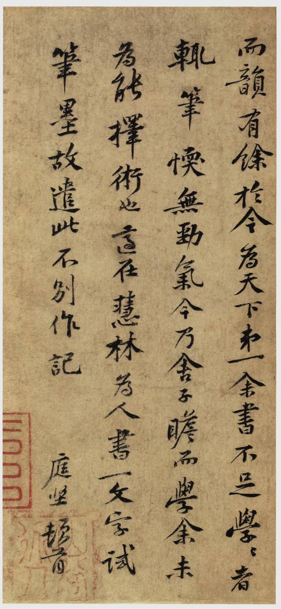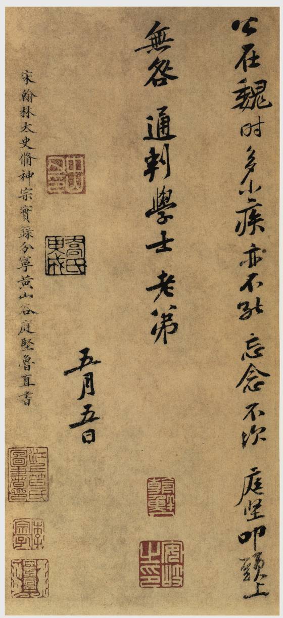 黃庭堅在上溯晉唐、學習前人經典書法時,對其影響最大的莫過於蘇軾,可以說黃庭堅的手劄小行書在很大程度上是學蘇軾的。黃庭堅作為“蘇門四學士”之一,不能不受蘇軾書風的影響。在黃庭堅書論中,評東坡書頗多,且多為推崇備至者。蘇東坡不僅是黃庭堅文學上的老師和提攜者,而且也是其書法的學榜樣。