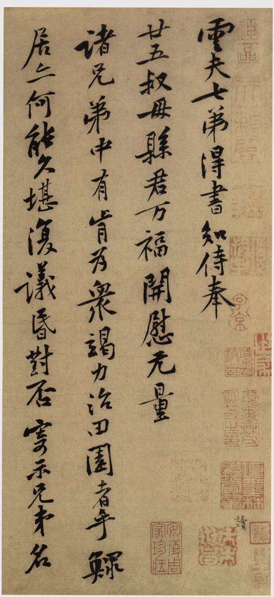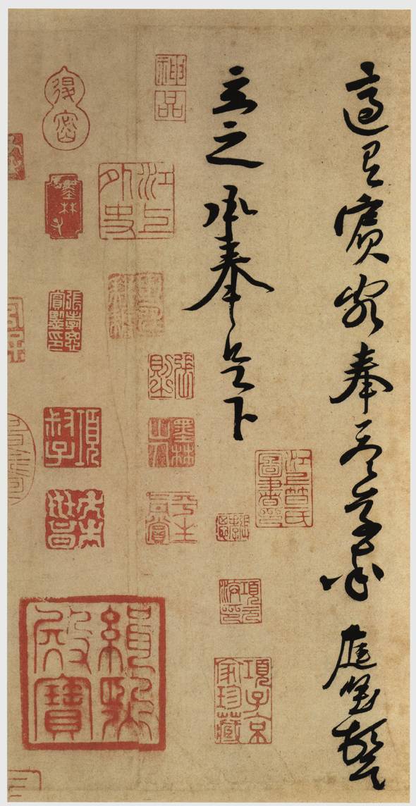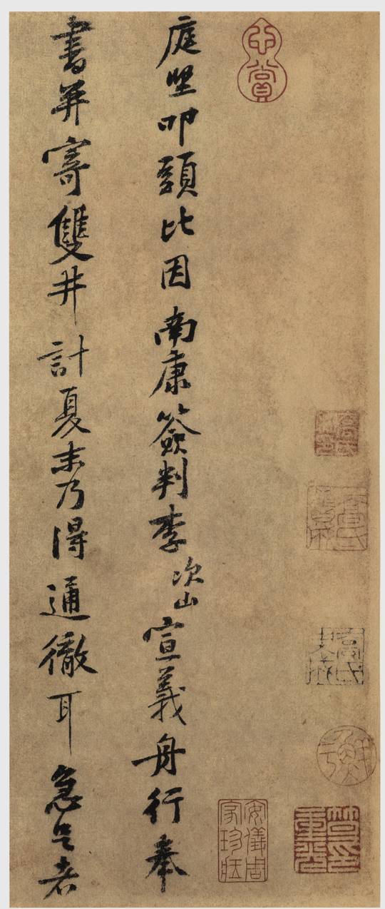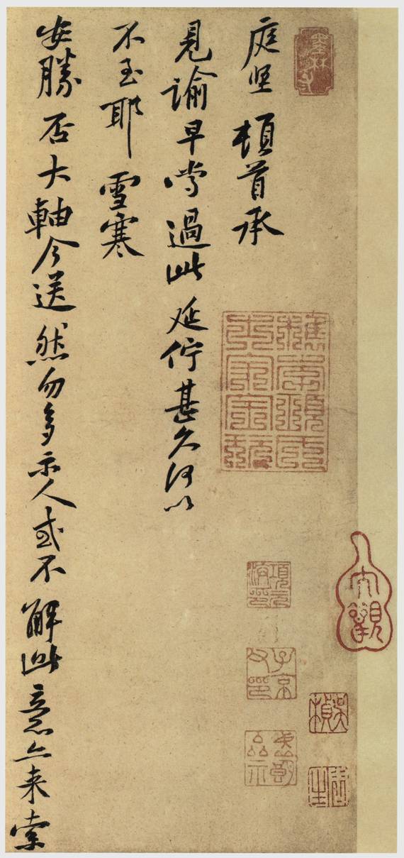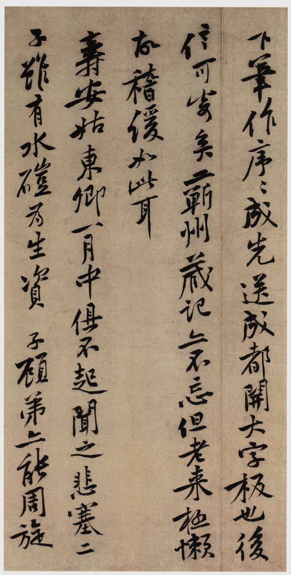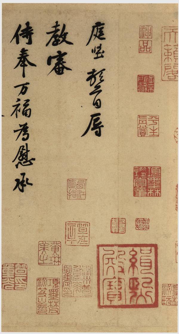 看到作品。從黃庭堅流傳至今的手劄墨跡看,其撇捺開張、字形扁闊、字勢向右上揚等,都明顯表現出蘇軾書法的特征,甚至有些誇張強調,唯嫌生澀,未有蘇書圃熟也。而黃庭堅以禪悟書當與蘇軾互為影響。如蘇軾《禱雨帖》,筆意極似黃庭堅,特別是其末尾數字,從容嫻雅,行筆鬆緩,幾若黃庭堅代筆。