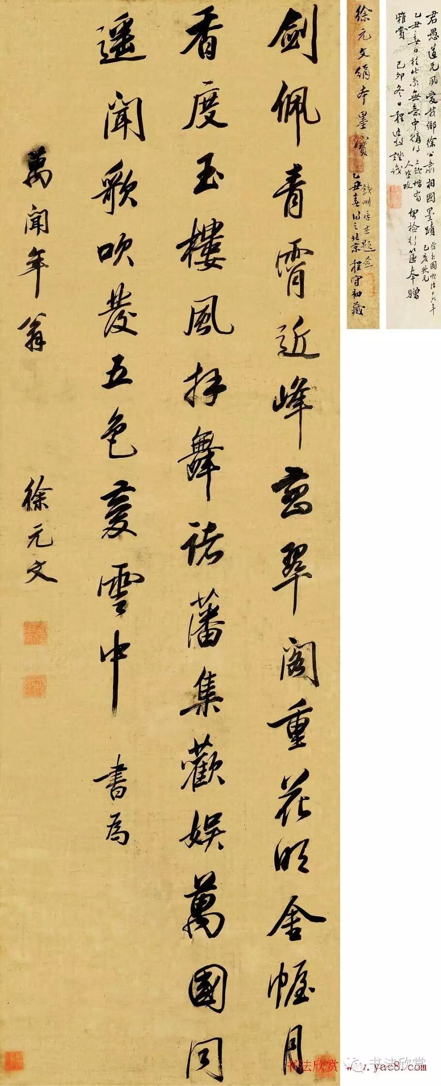 徐元文(1634-1691),字公肅,號立齋,江蘇昆山人。順治十六年(1659年)進士第一,順治帝稱徐元文為“佳狀元”,賜冠帶、蟒服、乘禦馬等,授翰林院修撰。康熙十八年,出任修《明史》總裁,後任左都禦史,官至文華殿大學士兼翰林院掌院學士。徐元文與其兄徐幹學、徐秉義都是進士出身,很有名望,號稱“昆山三徐”。著有《含經堂集》、《得樹園詩集》。