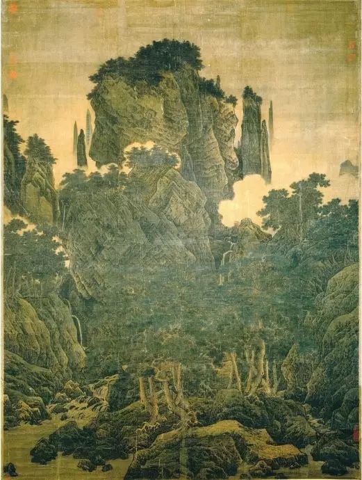 畫麵繪長鬆深壑,主峰聳峙,岩石壁立,山泉奔流。畫家雖采用北宋山水作品的全景式構圖,便取景的視點已拉得較近,用質實堅重的大斧劈皴表現岩石的方峻峭硬,加之用墨濃重,很好地表現出山水的壯美,給人以很強的視覺震撼,山水看來格外清晰,亦令觀者產生如臨其境、如在的感受,翻出了不同的山水氣象。