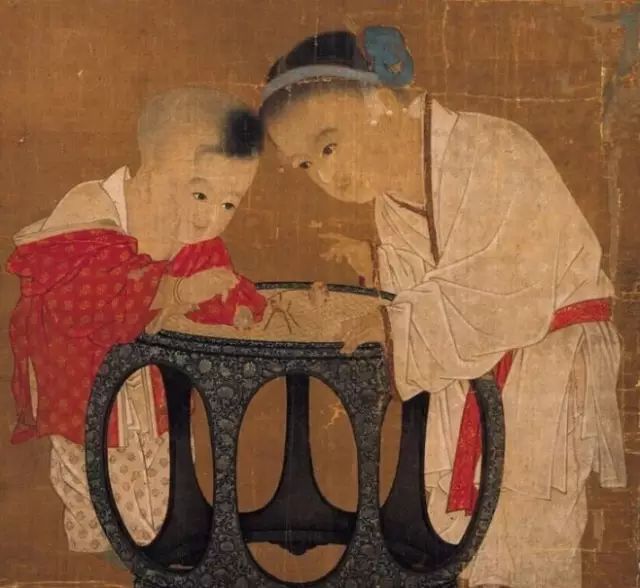 《秋庭戲嬰圖》為北宋畫家蘇漢臣所作。畫中庭院裏,姊弟二人圍著小圓凳,聚精會神地玩推棗磨的遊戲。不遠處的圓凳上、草地上,還散置著轉盤、小佛塔、鐃鈸等精致的玩具。背景部分,筍狀的太湖石高高聳立,造型堅實挺拔,周圍則簇擁著盛開的芙蓉花與雛菊,這樣的布局,不僅衝淡了湖石的陽剛之氣,也充分點出秋天的節令。