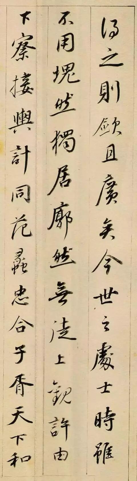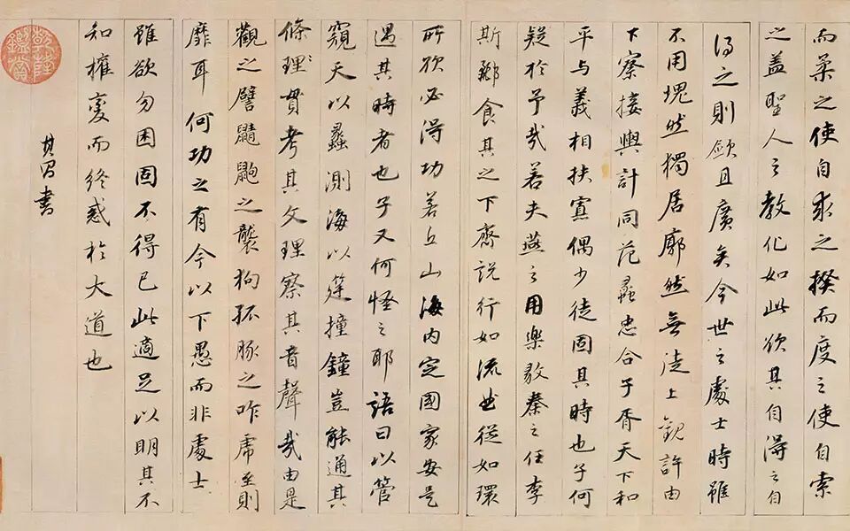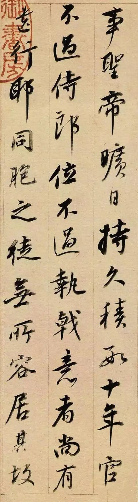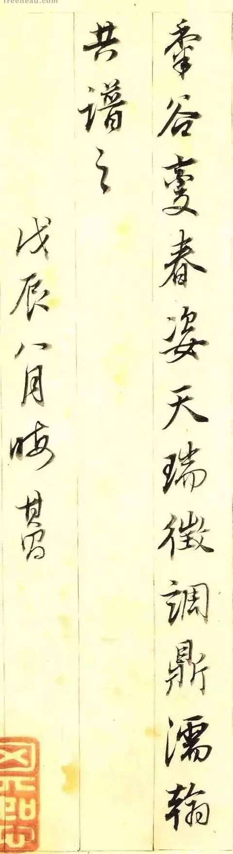 董其昌的書寫能結合自己的個性,力追帖學風神。此作行中兼楷,用筆有顏真卿的率意,體勢有米芾的欹側,布局得趙孟頫之風神,輕捷自如而風華自足,反映出一種人格風範。總之,他力追古法,體現了自然秀雅的書法風格,創造出一種不食人間煙火的氣象。品讀這件作品,有如清風拂麵,令人心氣爽然。從作品中,我們能感受到董其昌所具有的聰慧和機巧。康有為評價董其昌書法“如休糧道士”。要知“休糧道士”的遠離塵世、嫻靜安詳、不動聲色也是一種美。這種美雖然不同於剛毅之美,卻也是一種難得的境界。