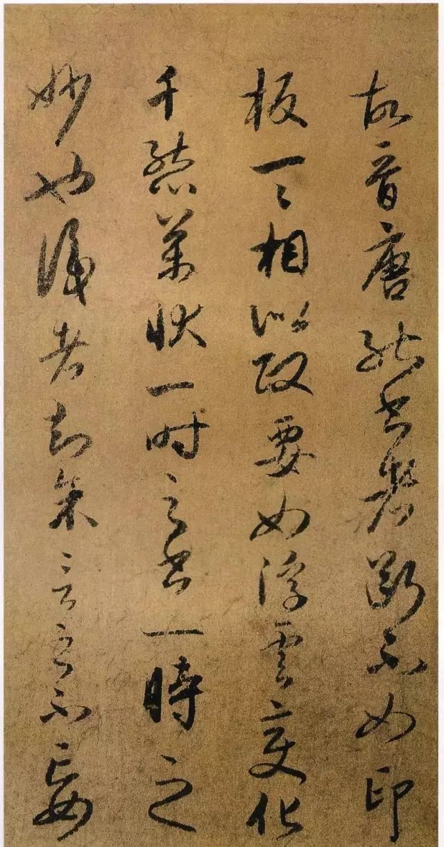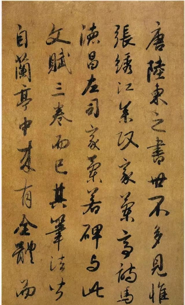 目前能見到的李倜墨寶隻有他為陸柬之《文賦》所作的兩段彌足珍貴的跋文。不妨以其領略一下大家的風範。這幅佳作筆畫間架的處理,信手拈出而觸處成妙,在平和寧靜之間盡情揮灑,儒雅動人,舒卷自如,無一筆不痛快,無一筆不沉著,含蓄、瀟灑、清雋、超逸,無雕飾,無燥氣,全是天真自然。正像他《跋陸柬之書文賦》中所說:“如浮雲變化,千態萬狀,一時之書一時之妙也。”既得晉人形質,又得晉人之神韻,充滿感人的鮮明的書卷氣息,真是極完美的技巧與極自然的審美意識的自然反映。就此一幅佳作就足以使李倜躋身於書法大師行列。