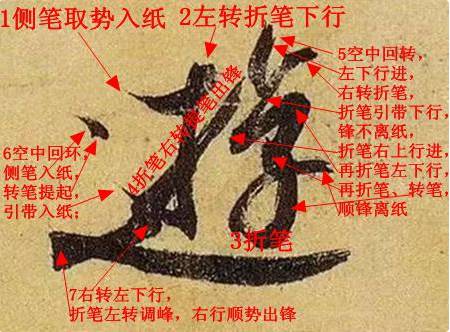 筆勢是指筆鋒的運行要依筆勢而行。筆勢是指筆鋒運行時的姿態與體勢,其要點是最適合在運行方向上運行的筆鋒的體勢,追蹤鋒麵是依勢行筆的要領。即在不同的運行方向上,必須以相應朝向的鋒麵著紙。這樣可以避免筆鋒扭擰,產生有害的扭力—“麻花勁”,以導致“筆主運”情形的發生。古人稱的“使轉”就是指轉換鋒麵的技術。這是高難的技能。用筆的全部學問,幾乎盡在使轉。