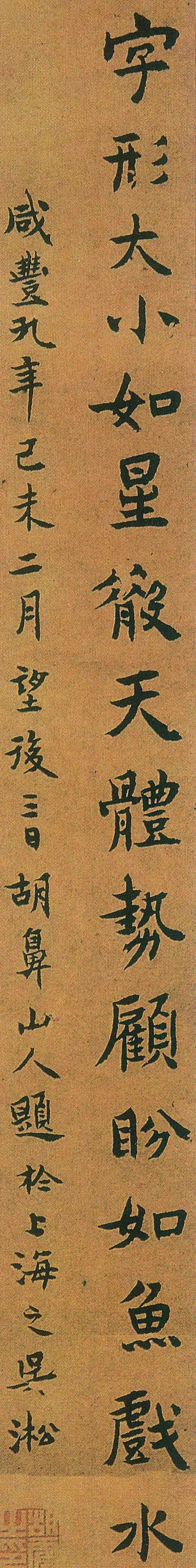 胡震(1817-1862),號鼻山,一號胡鼻山人,別號富春大嶺長。浙江富陽諸生,僑寓上海。習摹印,嗜金石,深究篆、籀、八分、六書、小學。隸字、行書均高古。