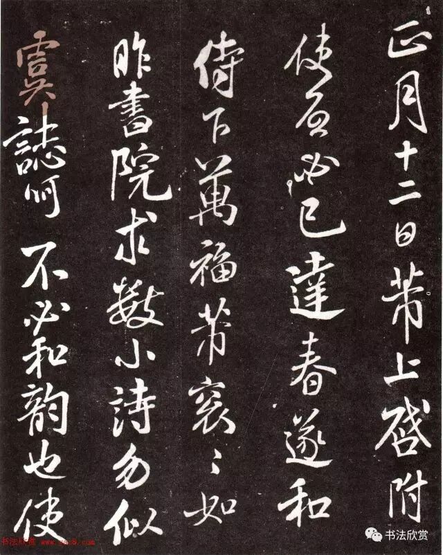 釋文:正月十二日,芾上啟。附使啟必已達。春遂和,侍下萬福。芾袞袞如昨,書院求數小詩。勿似虞誌嗬,不必和韻也,使吾友發一笑於薄間也。謹上啟,不宣。芾頓首再拜。天啟人英學士吾友。