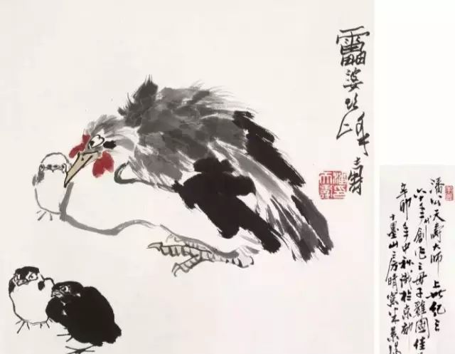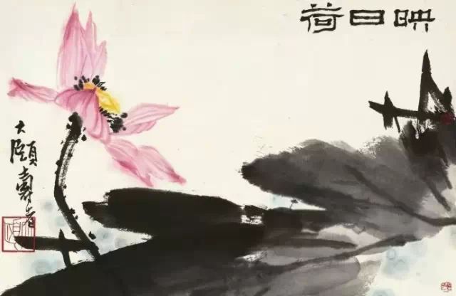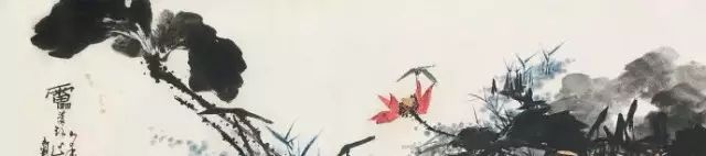 潘天壽的指畫也可謂別具一格,成就極為突出。這類作品,數量大,氣魄大,如指墨花卉《晴霞》、《朱荷》、《新放》等,畫的均為“映日荷花”,以潑墨指染,以掌抹作荷葉,以指尖勾線,生動之氣韻,非筆力所能達。潘天壽作畫時,每畫一筆,都要精心推敲,一絲不苟。他在“有常必有變”的思想指導下,取諸家之長,成自家之體,他的畫材為平凡題材,但經他入手的畫,卻能產生出不平凡的藝術感染力。如他的《小龍湫一角》特別是把畫麵主體小龍湫壓到邊角的構圖,含蓄地讓觀者先看靈岩的磅礴山勢,爛漫的山花然後再去欣賞那支龍湫水,這種方法,正與那些使畫麵“一覽無餘”形成對照,不僅顯示了畫家出奇製勝的構圖才能,也表述了畫家對平凡事物的內在感情。