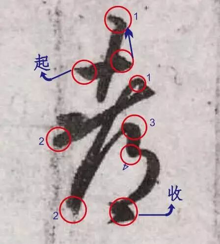 示圖中的紅圈就是我們讀帖的關鍵點,各紅圈之間是行筆時“提“、”按”之間相互調和的結果,每個關鍵點又可都是兩兩紅圈之間行筆路徑的起點或收點。這個應該不難理解。