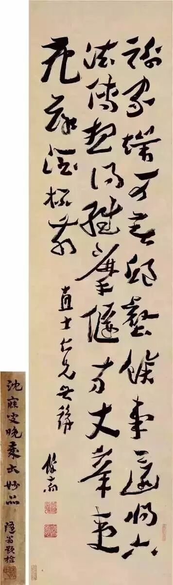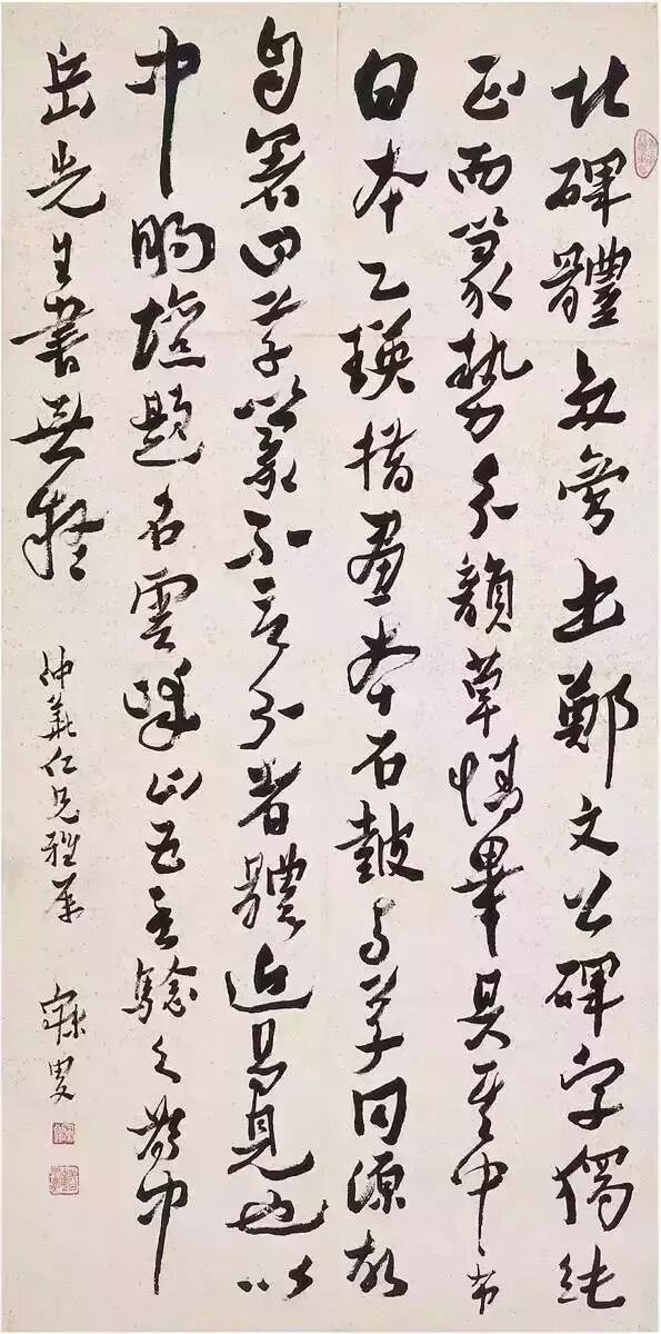 沈曾植為學博雅,知類通達,開物成務。精通史學、法學、經學、考據、道藏、佛學、樂律等學問,識見宏遠,被讚為“同光朝第一大師”。沈氏一生大部分時間用於政務和學問上,書學乃是餘事,但先生學養深厚,筆下生風,別俱麵?。金蓉鏡稱:“先生早精帖學,得筆於包安吳,壯嗜張廉卿”。即說沈氏早年學淳化閣帖,二王及唐楷,後得益於包世臣、張裕釗。馬一浮說先生還學習過歐陽通的《道因法師碑》。沈先生學書經曆比較複雜,在先生的題拔書信中,可見先生鑽研過 章草、簡牘和經體,其中還有黃山穀和米芾的影子。先生寫字強調變化,抒發胸中之奇,幾忘紙筆,心行而已。受到當時書法界的推崇,海內外求其字者頗多。先生以草書著稱,取法廣泛,熔漢隸、北碑、章草為一爐。碑、帖並治,尤得力於“二爨”,體勢飛動樸茂,純以神行。個性強烈,為書法藝術開辟出了一個新的境界。