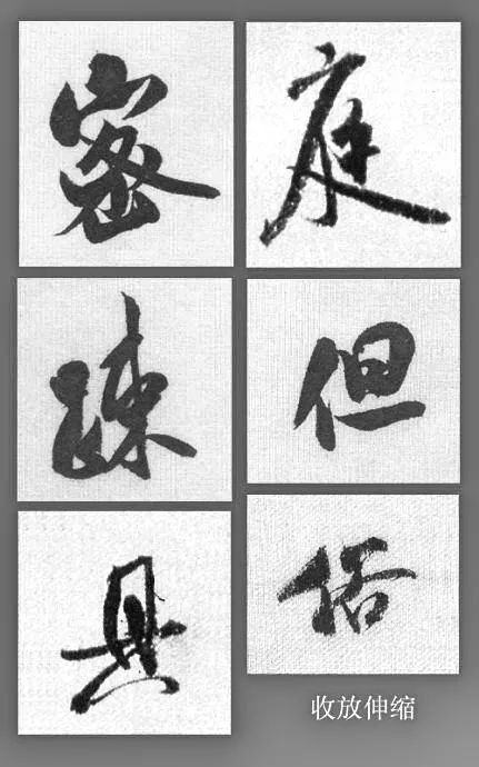 為了對比變化的需要,字的某一筆畫(部分)左右收縮,突出另一筆畫(部分);為了對比變化的需要,字的某一筆畫(部分)上下伸展,另一筆畫(部分)收縮。