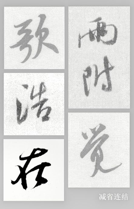 行書與楷書另一大區別就是行書下筆收筆的連絲呼應,使得點畫方向性加強,氣的表現更強烈,表現在結字上,便是省簡了筆畫,這些連結一起的筆畫組成了不同趣味性的組合,形成對比。