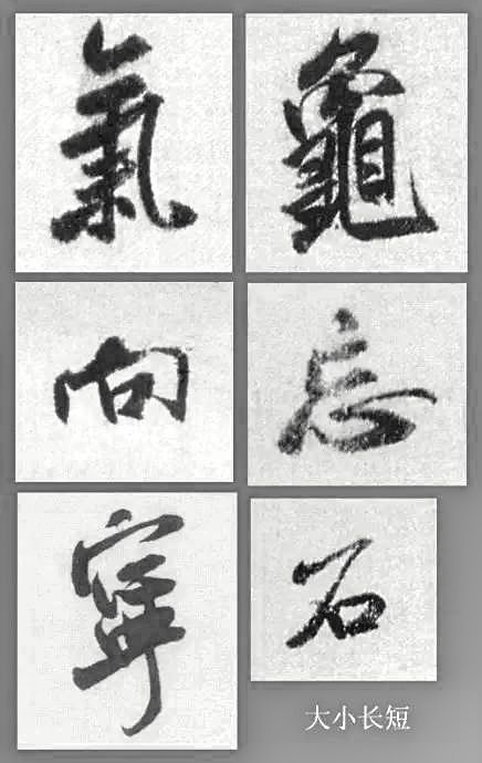 首先我們要整體把握字形的大小長短。古人說寫字最怕“字如算子”,在結字方麵就是避免字字大小劃一,如是則毫無藝術性可言了。掌握好這一規律,能使我們在臨摹、創作時對單個字的字形有整體的把握。這點是初學者臨摹過程中最容易犯錯的。