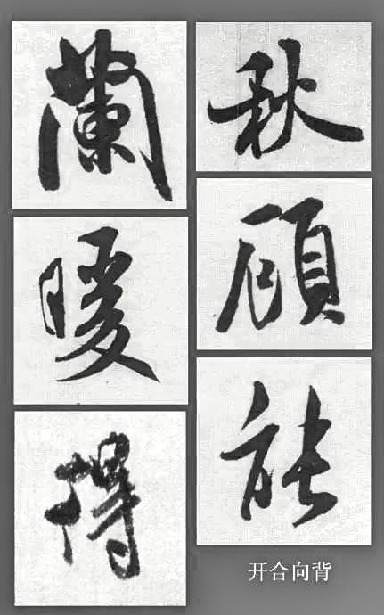 所謂開,是指字的筆畫有向外拓展的趨勢;所謂合,是指字的筆畫呈向內聚攏的趨勢。開合又稱“向背”,背者為開,向者為合。米行書中宮緊收,結字以開(背)為主,顏行書外緊內鬆,結字以合(向)為主。其實每位書家的結字都有開有合,或開中有合,合中有開,如此方顯得生動。