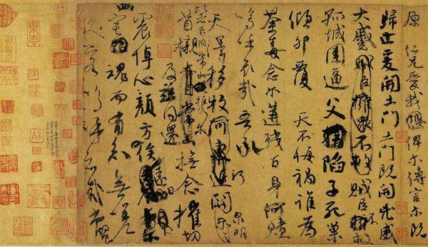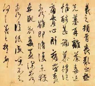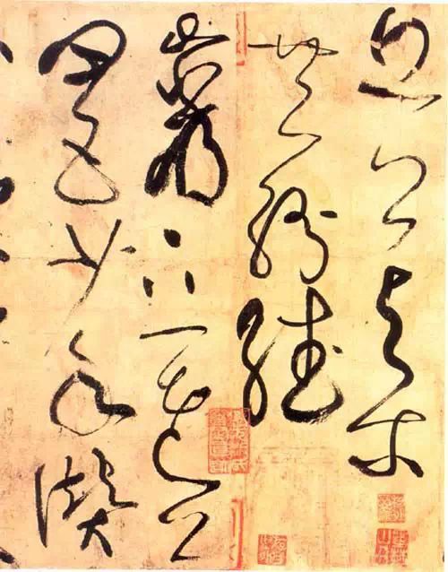 草書發展到唐代,在東晉“今草”基礎上又有飛躍發展。草書的字形進一步被打開,草書中漢字的實用信息傳遞功能進一步被消減,書法的抒情性得到進一步加強。一種與音樂相類似的通過漢字書寫表現情感的純藝術——“狂草”由此誕生。推動草書藝術走峰巔的,正是中國書法史上的奇人——大書法家張旭。唐代大文豪韓愈曾描述曰:“往日張旭善草書,不治他技。喜怒窘窮,憂悲、愉夫、怨恨、思慕、酣醉、無聊、不平,有動於心,必於草書焉發之。觀於物,見山水崖穀,鳥獸蟲魚,草木之花實,日月列星,風雨水火,雷霆霹靂,歌舞戰鬥,天地事物之變,可喜可愕,一寓於書。故旭之書,變動猶鬼神,不可端倪。以此終其身而名後世。”唐人好以書飾壁,相傳張旭經常是狂飲大醉,然後舉筆“呼叫狂走,乃下筆”。甚至瘋狂地“以頭濡墨而書”,“既醒自視以為神,不可複得也”。因此他在曆史上得了一個外號“張顛”。張旭的草書縱橫奔放,氣勢淩厲,一如李白的詩,彌漫著一股盛唐時代特有的浪漫氣息。這裏凝聚著他一生的悲歡,也融鑄著他一生的憤懣憂鬱。時人以李白之詩、裴旻之劍、長史之草書為盛唐“三絕”。